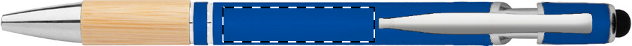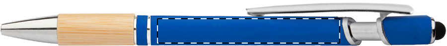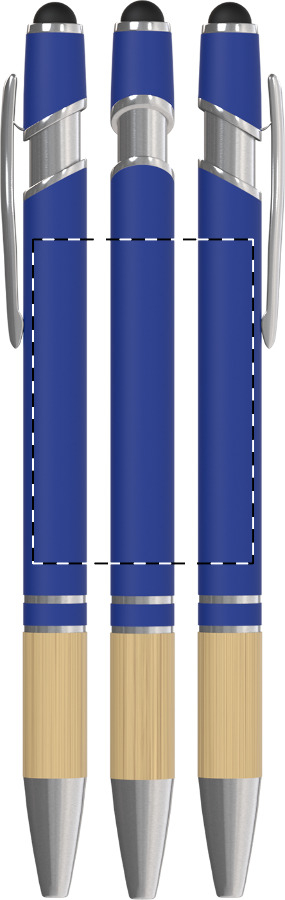 Modré kuličkové pero Bonnel kombinuje odolné hliníkové tělo s přírodním bambusem pro příjemný a jistý úchop při dlouhém psaní. Matný pogumovaný povrch v modré barvě doplňuje praktický stylus, který šetří displeje telefonů a tabletů od otisků prstů.