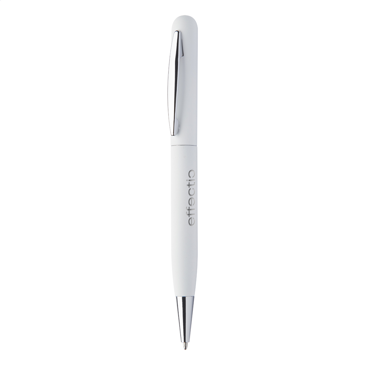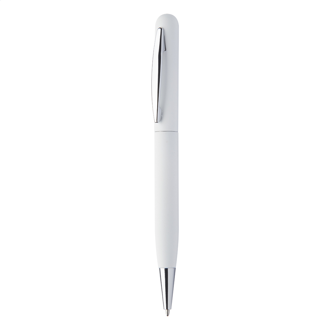 Kovové kuličkové pero s otočným mechanismem, pogumovaným povrchem a modrou náplní. Gravírovaná loga budou mít lesklou stříbrnou barvu. Mechanismus: otočný. Certifikace Twist action.