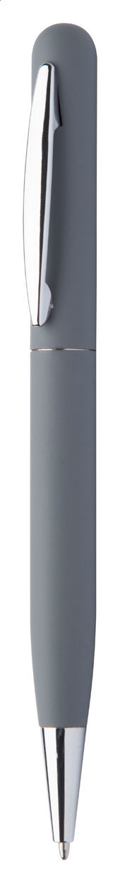 Kovové kuličkové pero s otočným mechanismem, pogumovaným povrchem a modrou náplní. Gravírovaná loga budou mít lesklou stříbrnou barvu. Mechanismus: otočný. Certifikace Twist action.