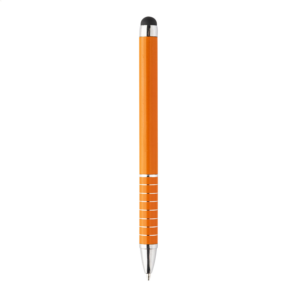 Elegantní oranžové kuličkové pero z lehkého hliníku propojuje klasické psaní s moderním ovládáním dotykových obrazovek. Metalický povrch v zářivém odstínu doplňuje spolehlivý otočný mechanismus a modrá náplň pro plynulý zápis bez vynechávání.