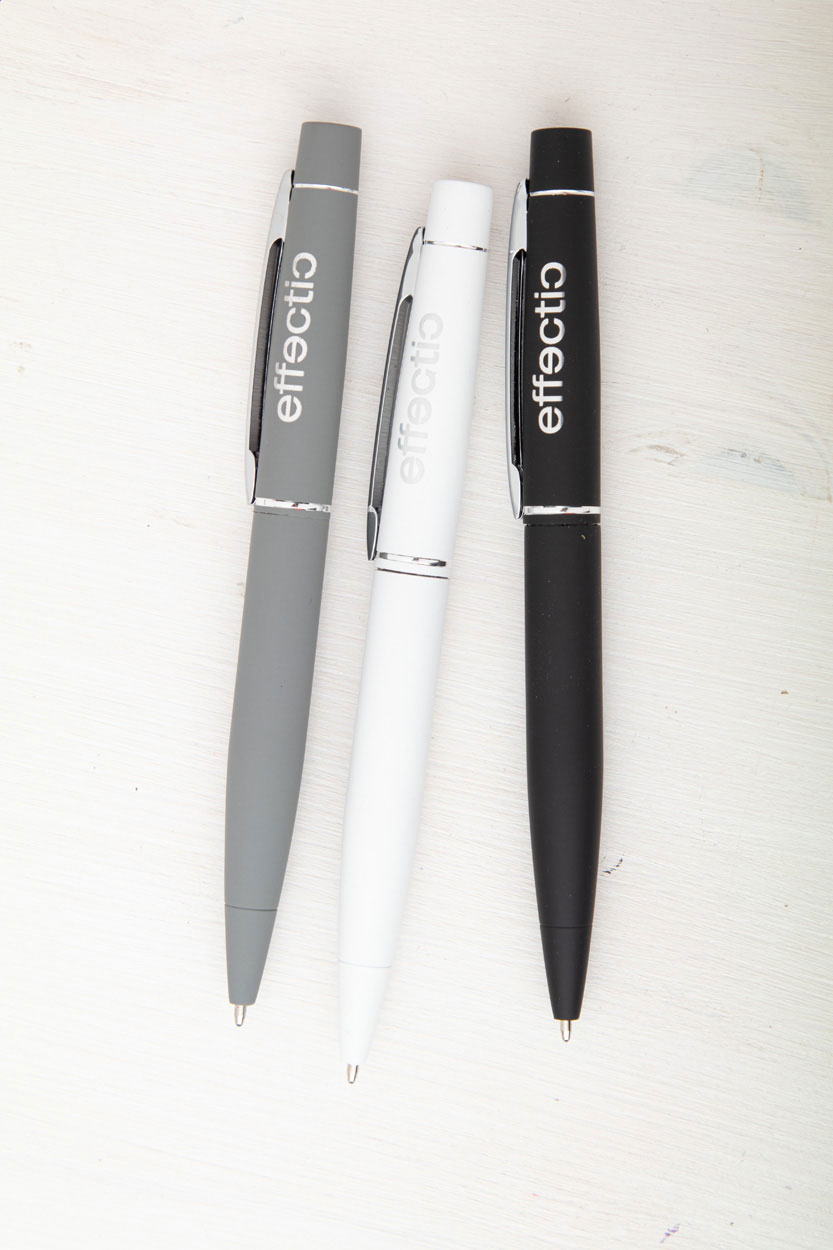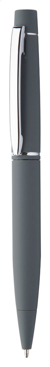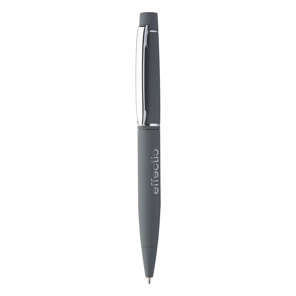 Kovové kuličkové pero s otočným mechanismem a pogumovaným povrchem. Modrá náplň. Gravírované motivy budou mít stříbrnou barvu. Mechanismus: otočný. Certifikace Twist action.