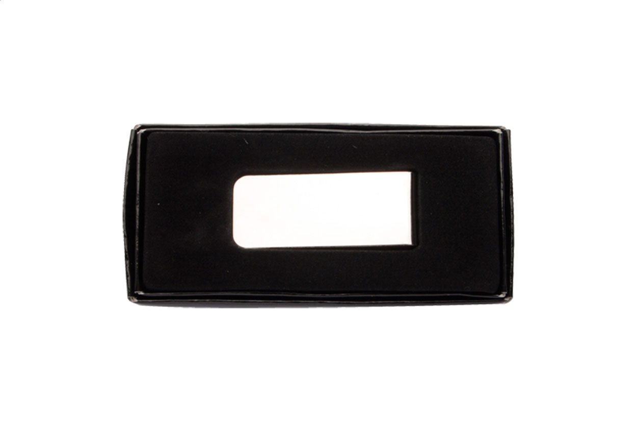 Kovový klip na peníze s chromovaným povrchem. V krabičce z černého kartonu.