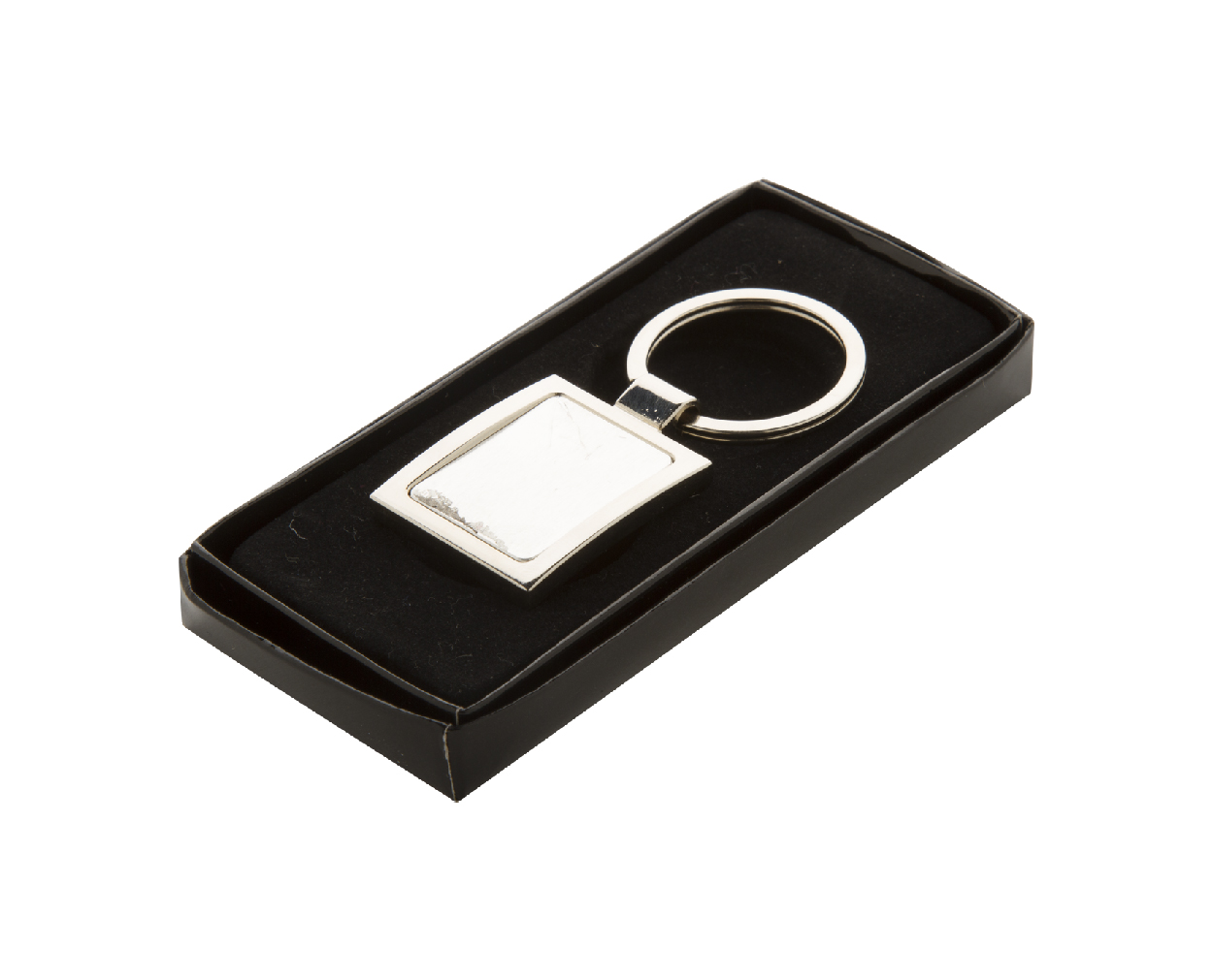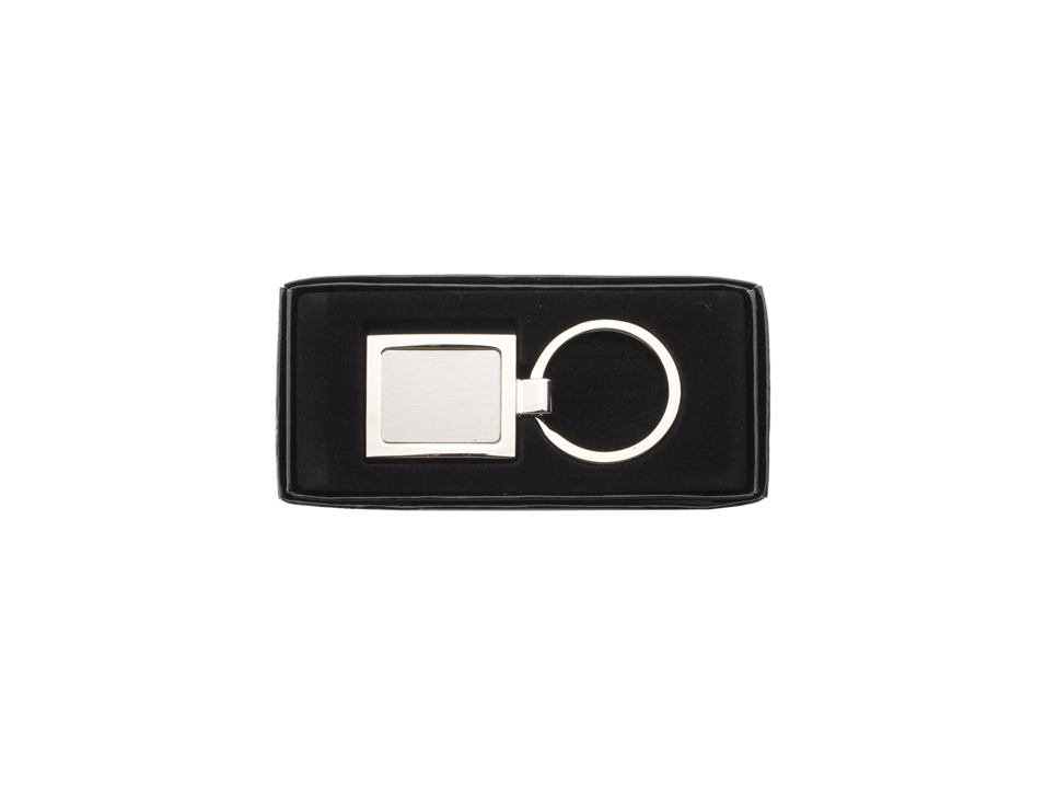 Kovový přívěsek na klíče v krabičce z černého kartonu.