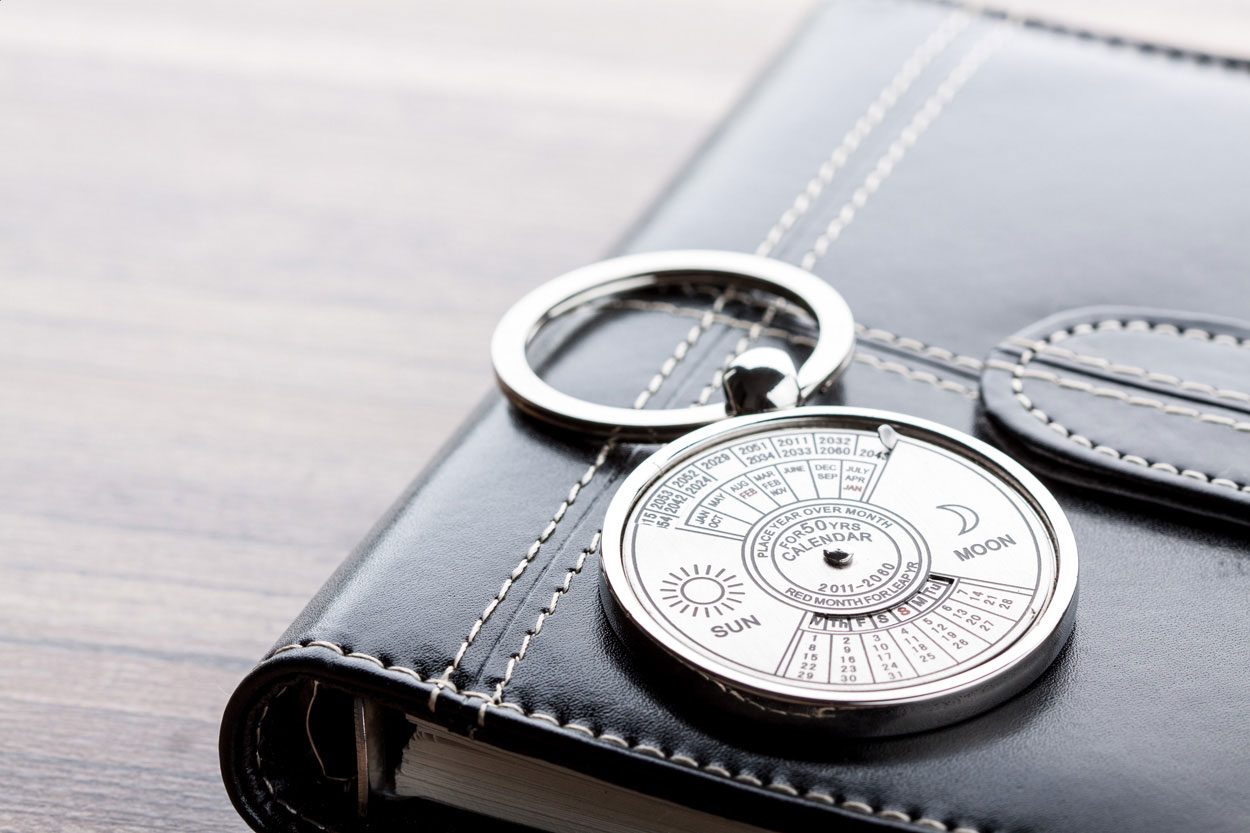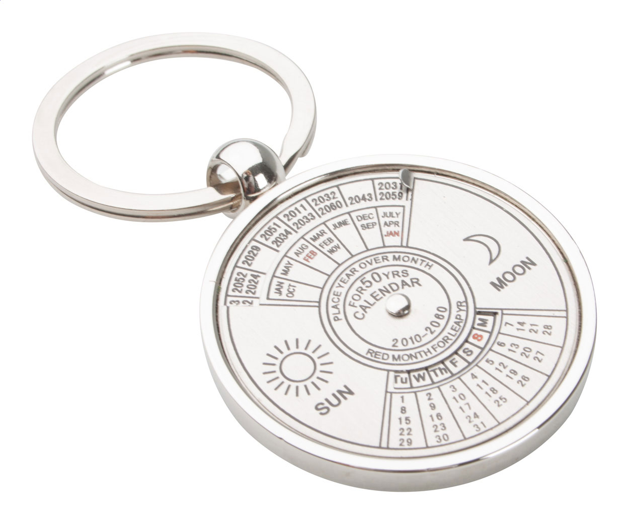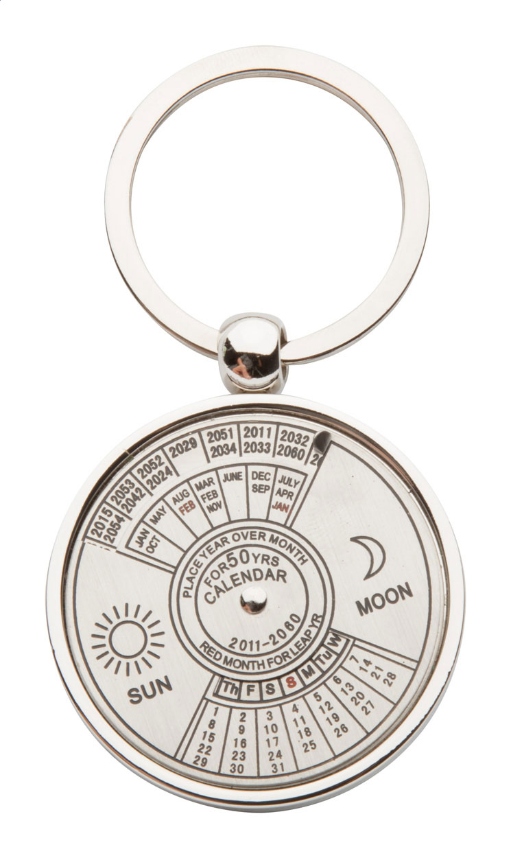 Kovový přívěsek na klíče s otočným kalendářem až do roku 2060. Baleno v černé dárkové krabičce.