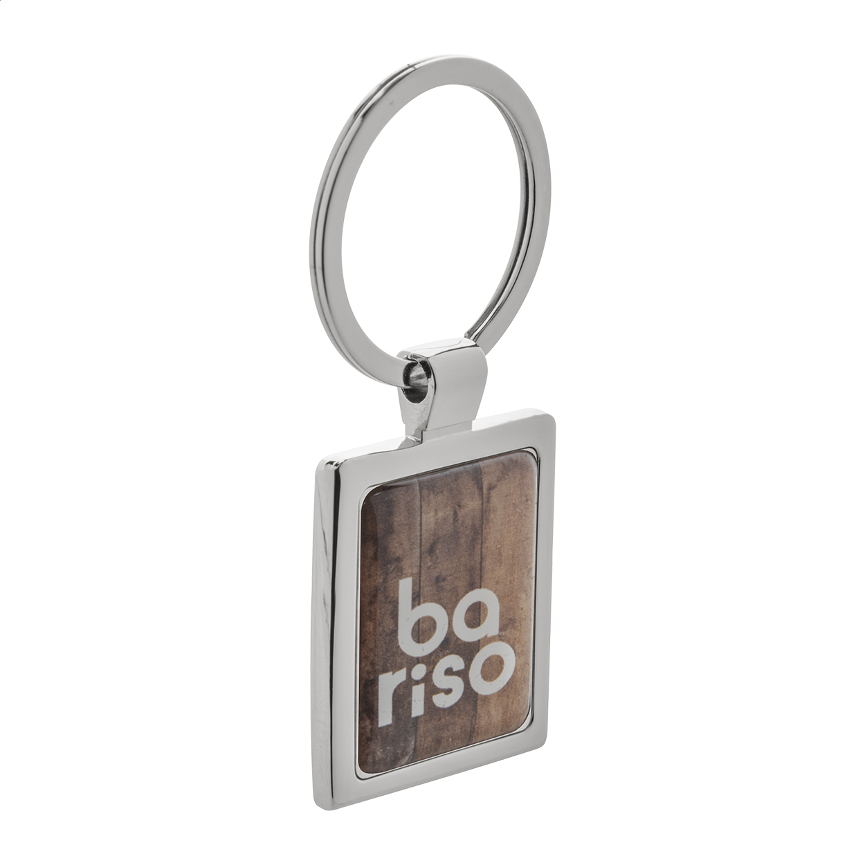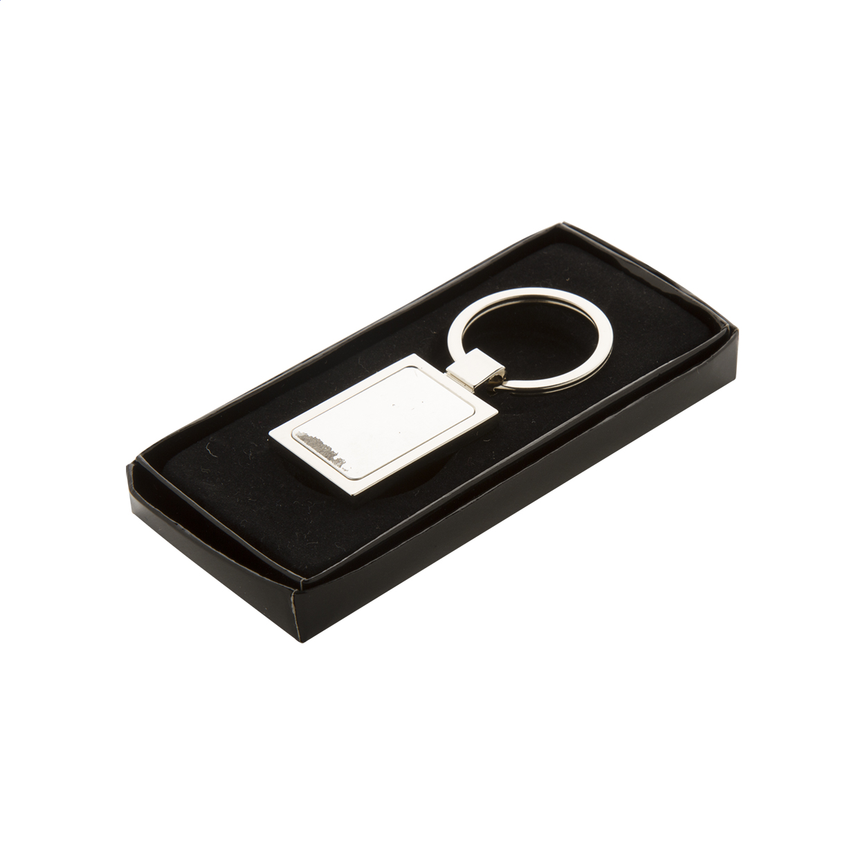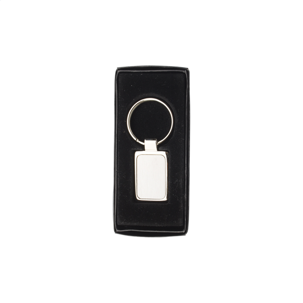 Kovový přívěsek na klíče v krabičce z černého kartonu.