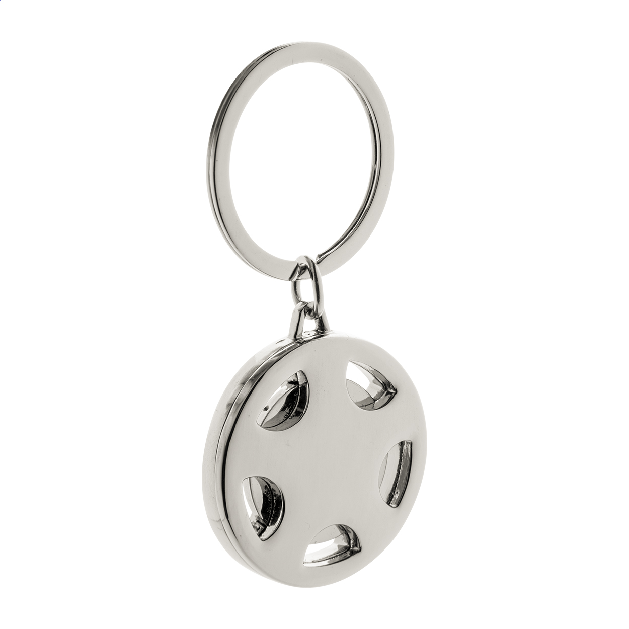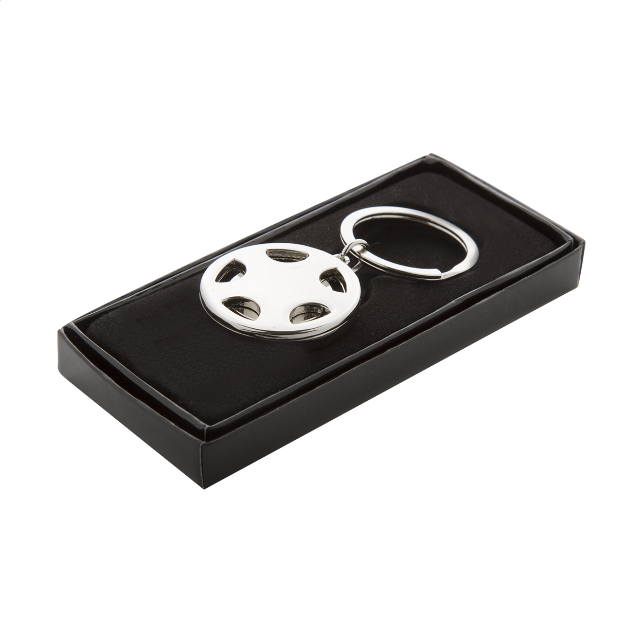 Kovový přívěsek na klíče ve tvaru volantu s kovovým žetonem do nákupního vozíků. V černé dárkové krabičce.