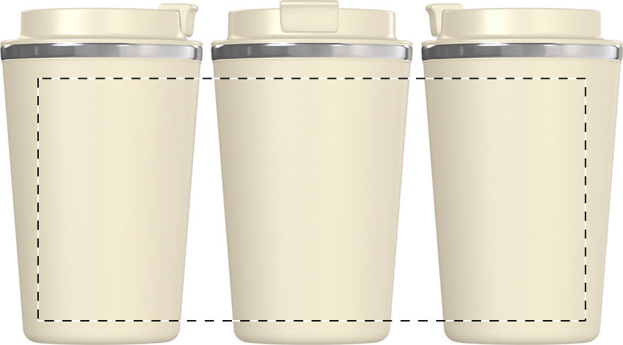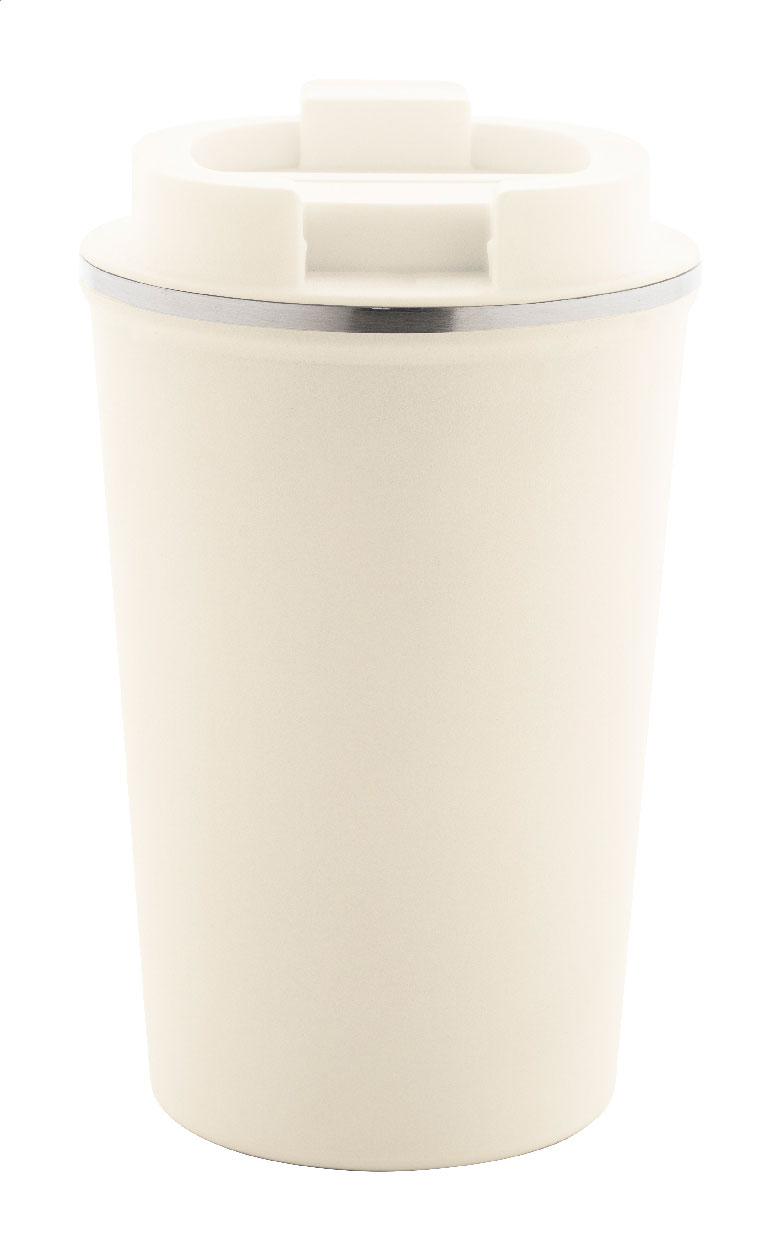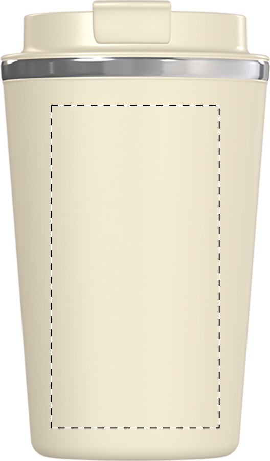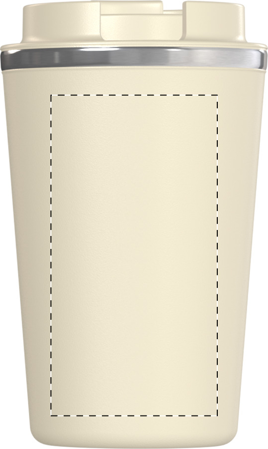 Hrnek má praktické víčko s uzavíratelným otvorem na pití, které zabraňuje rozlití a umožňuje pohodlné používání jednou rukou. Povrch v přírodní béžové barvě působí čistě a profesionálně, doplněný o decentní kovový lem po obvodu víčka.