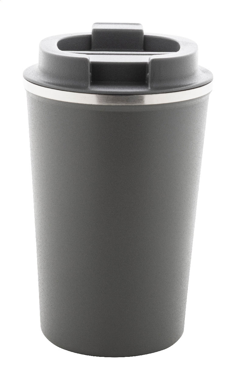 Hrnek má praktické víčko s uzavíratelným otvorem na pití, které zabraňuje rozlití a umožňuje pohodlné používání jednou rukou. Povrch v matně šedé barvě působí čistě a profesionálně, doplněný o decentní kovový lem po obvodu víčka.