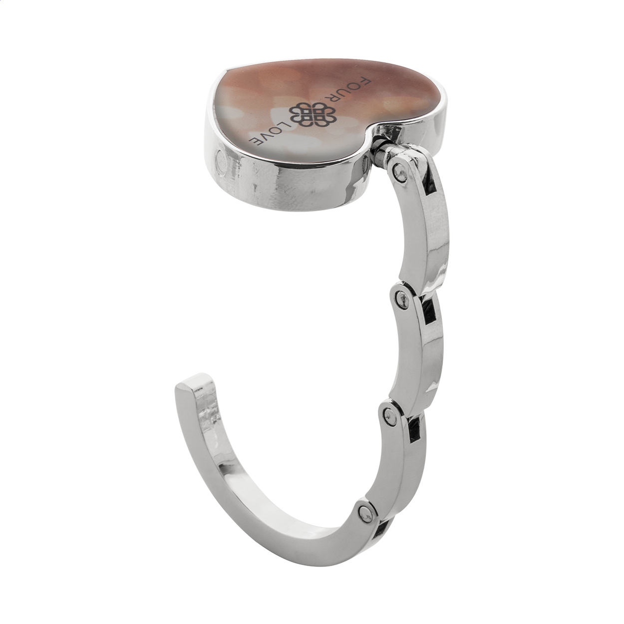 Kovový přenosný věšáček na tašku. Má tvar srdce a magnetické zavírání. V černé dárkové krabičce.
