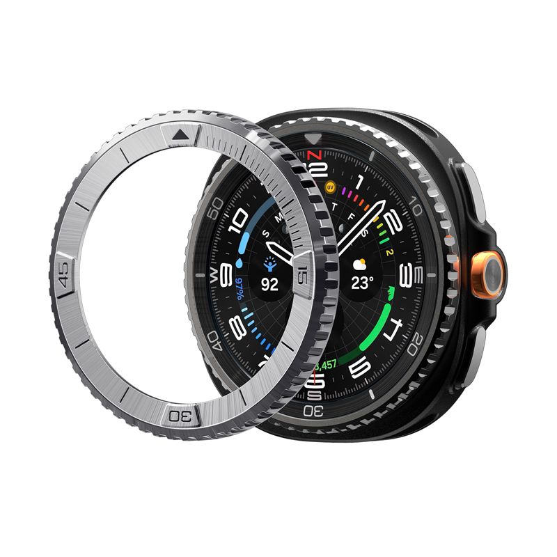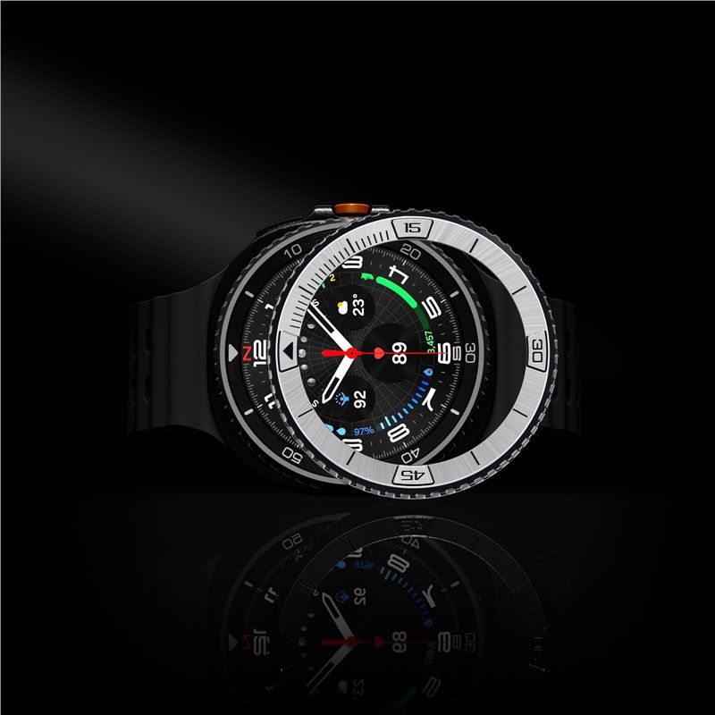 Dekorativní ochranný rámeček v provedení Pilot přináší luxusní vzhled a zvýšenou ochranu pro chytré hodinky Samsung Galaxy Watch 8 Classic 46mm. Kombinace černé horní vrstvy a stříbrné spodní části vytváří sofistikovaný design, který efektivně brání poškrábání displeje i těla hodinek.