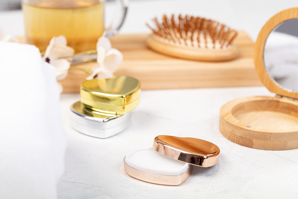 Vanilkový balzám na rty v recyklované ABS krabičce v kovové barvě ve tvaru srdce, s ochranou SPF15. Výrobek neobsahuje složky živočišného původu.