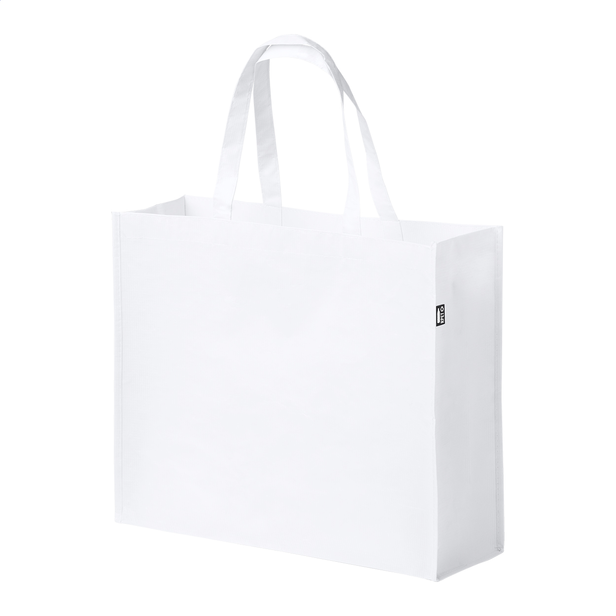 Prostorná nákupní taška s laminovaným povrchem vyrobená z recyklovaných PET lahví (gramáž 105 g/m2).