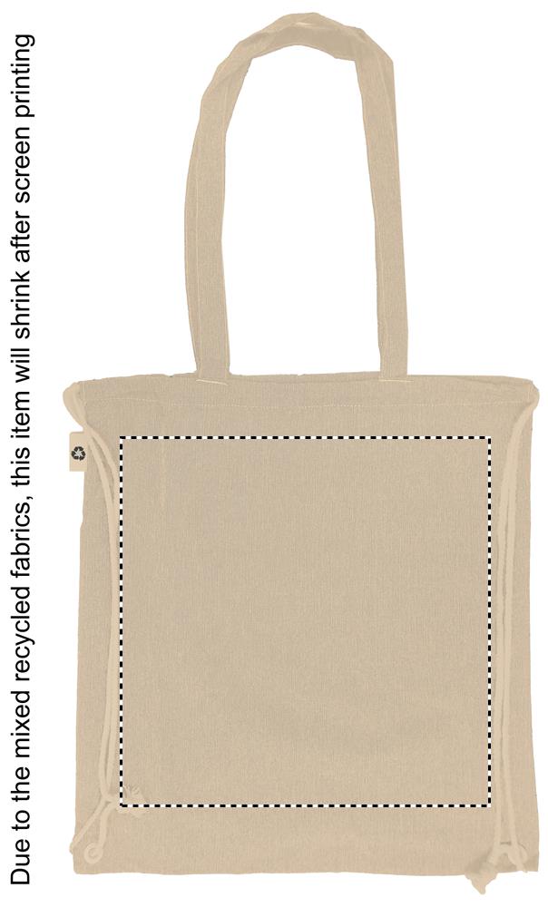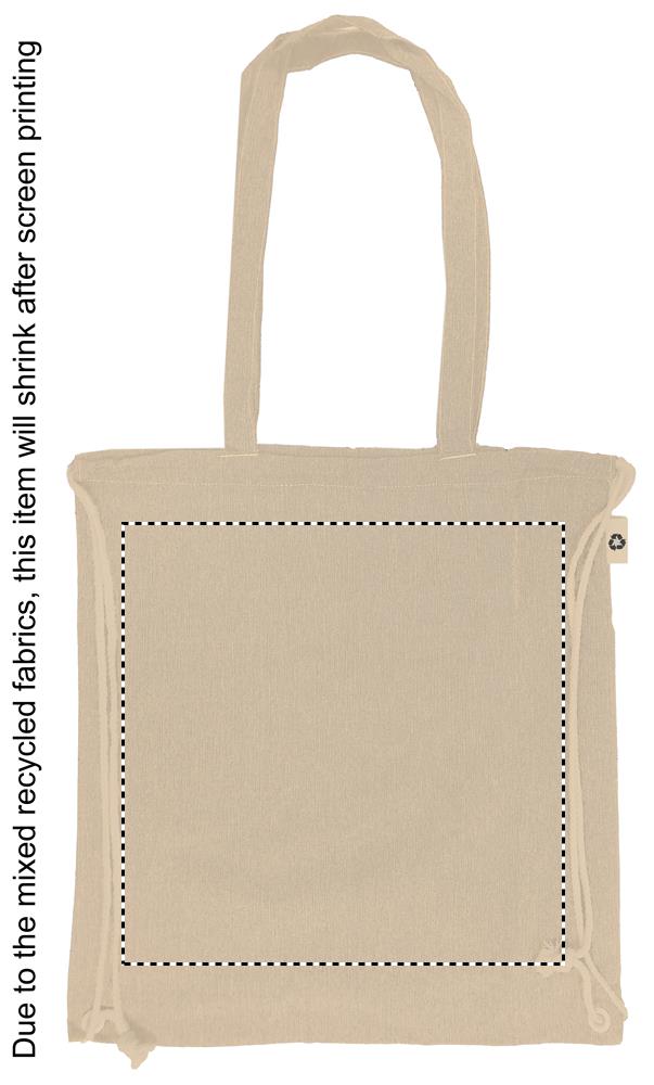 Látková nákupní taška s dlouhými uchy vyrobená z recyklované bavlny a recyklovaného polyesteru. Tašku je možné nosit také jako batoh díky šňůrkovým popruhům. Gramáž látky cca 140 g/m2. Taška se může srazit během potisku.