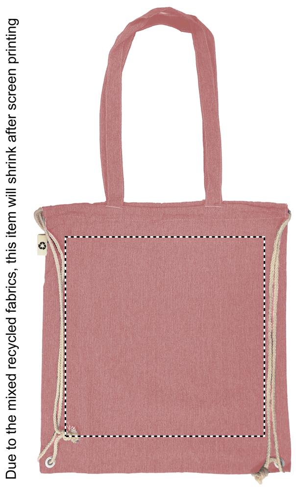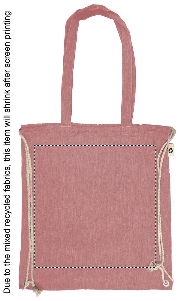 Látková nákupní taška s dlouhými uchy vyrobená z recyklované bavlny a recyklovaného polyesteru. Tašku je možné nosit také jako batoh díky šňůrkovým popruhům. Gramáž látky cca 140 g/m2. Taška se může srazit během potisku.