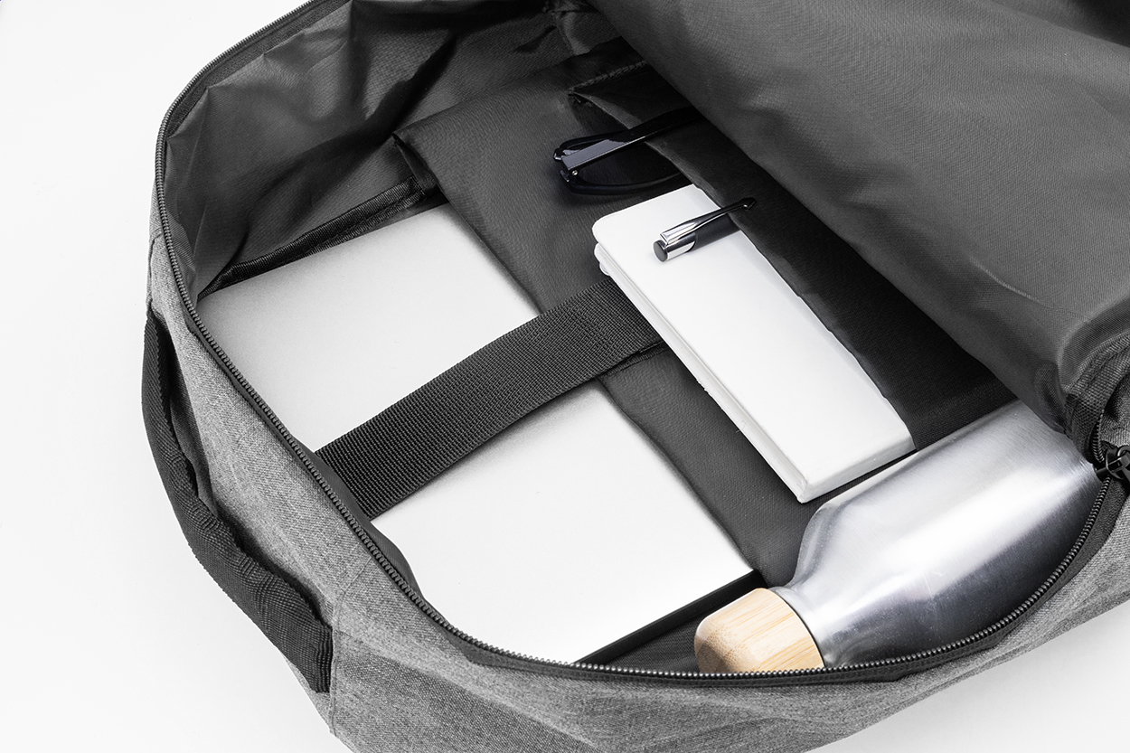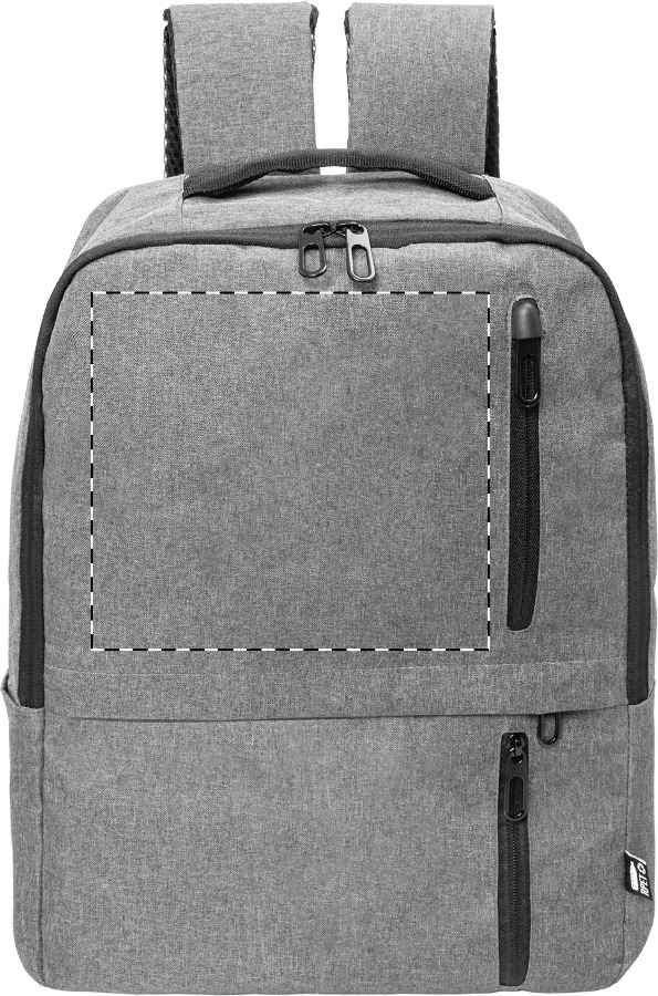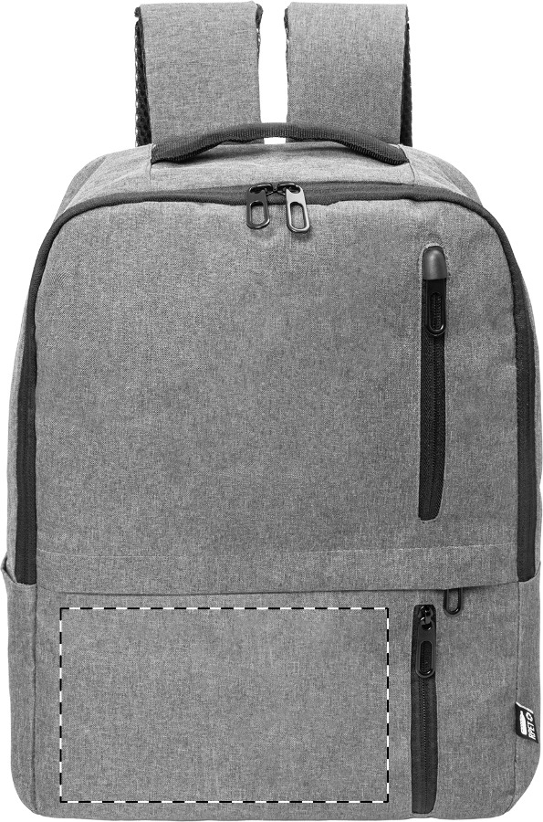 RPET batoh s hlavní přihrádkou na zip a 3 předními kapsami na zip. S polstrovanými přihrádkami na tablet (10") a notebook (15"), polstrovanými zády a ramenními popruhy. 600D RPET polyester s výrazným štítkem RPET.