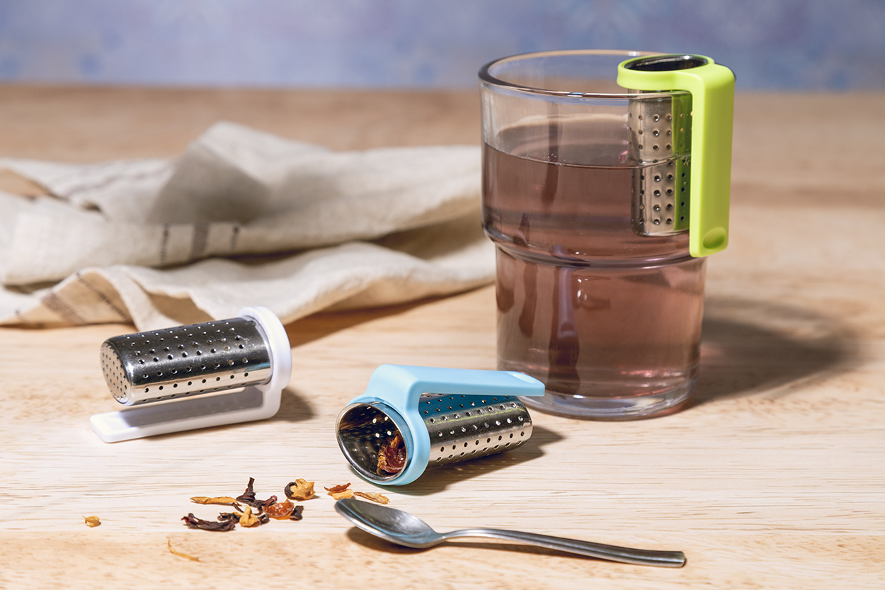 Nerezové sítko na čaj s praktickým klipem z recyklovaného ABS plastu. Navržen pro snadné připevnění k okraji hrnku.