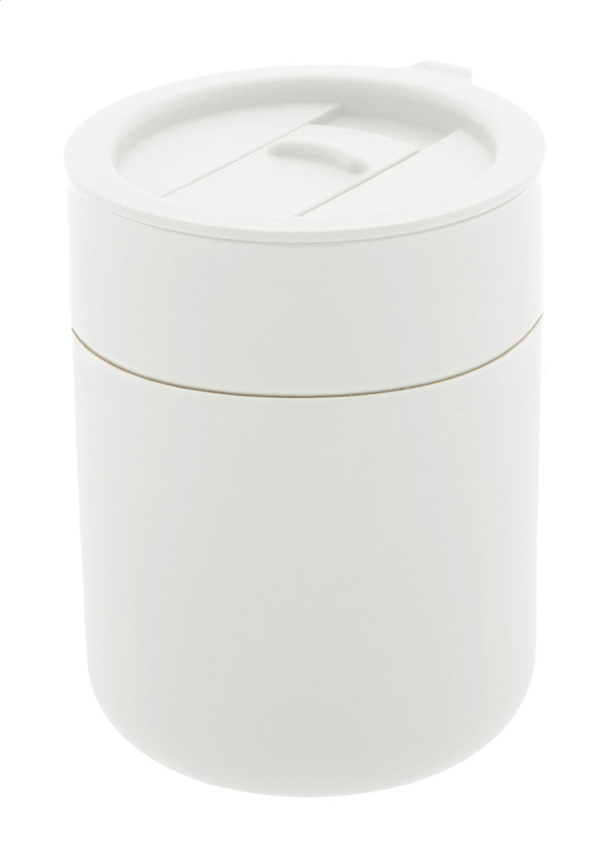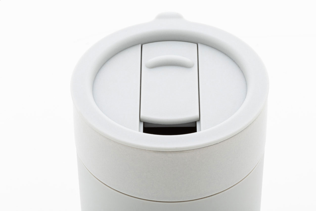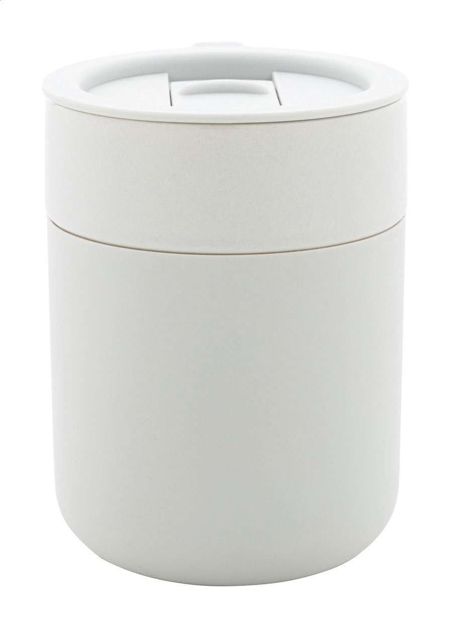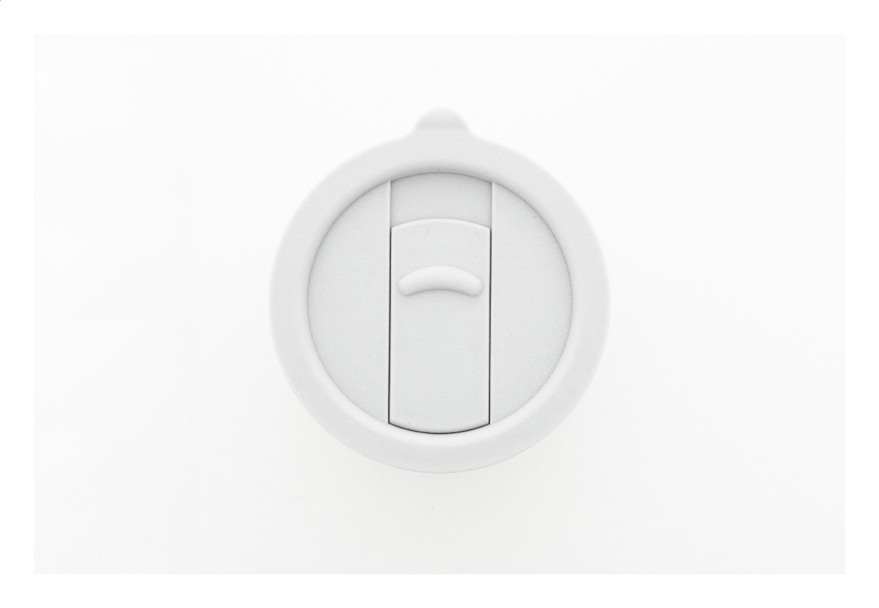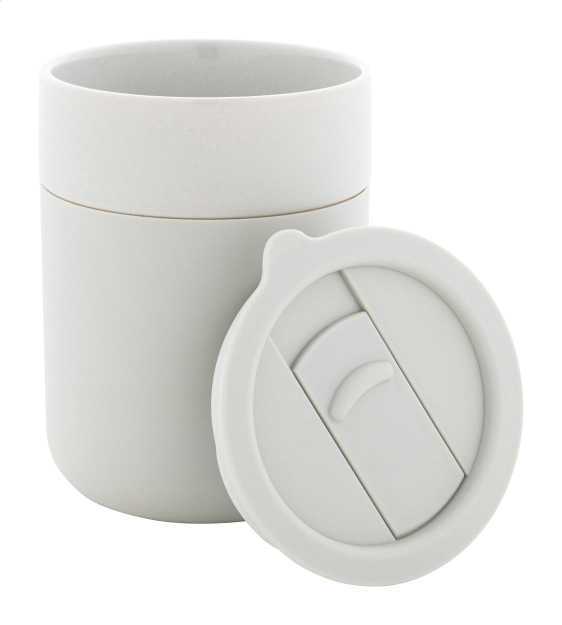 Silikonem potažený keramický cestovní kelímek s PP plastovým odkapávacím víčkem. 300 ml.