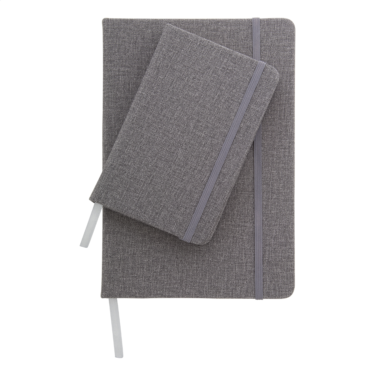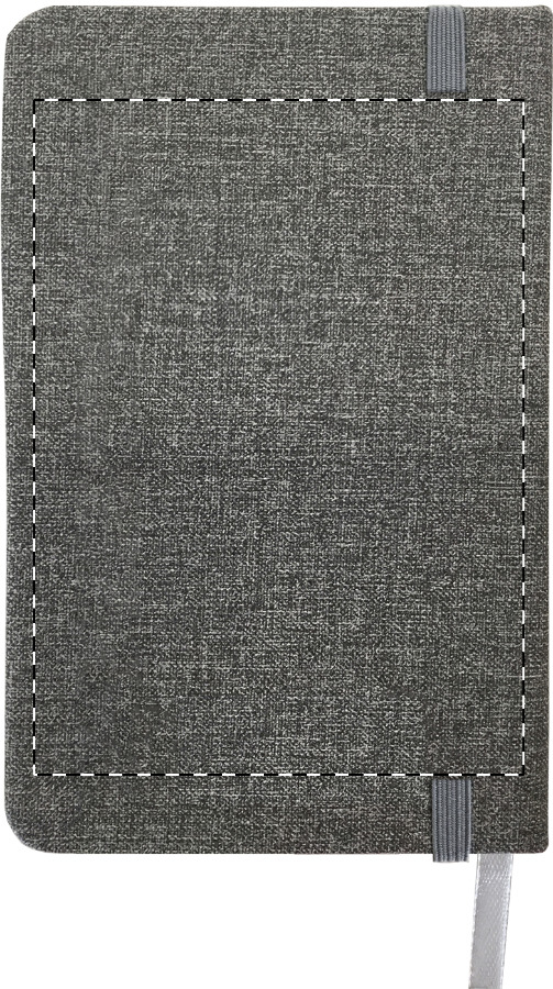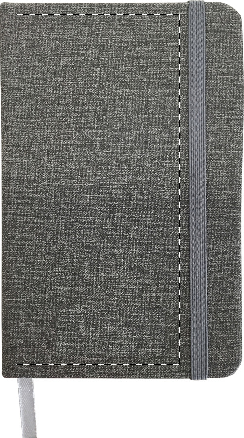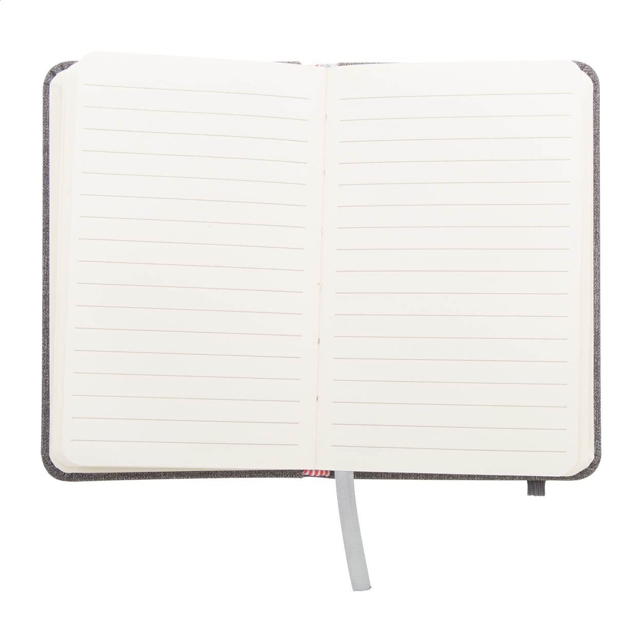 Poznámkový blok formátu A6 s deskami ze strukturované PU kůže. Obsahuje 80 linkovaných listů a má gumičku na zavírání.