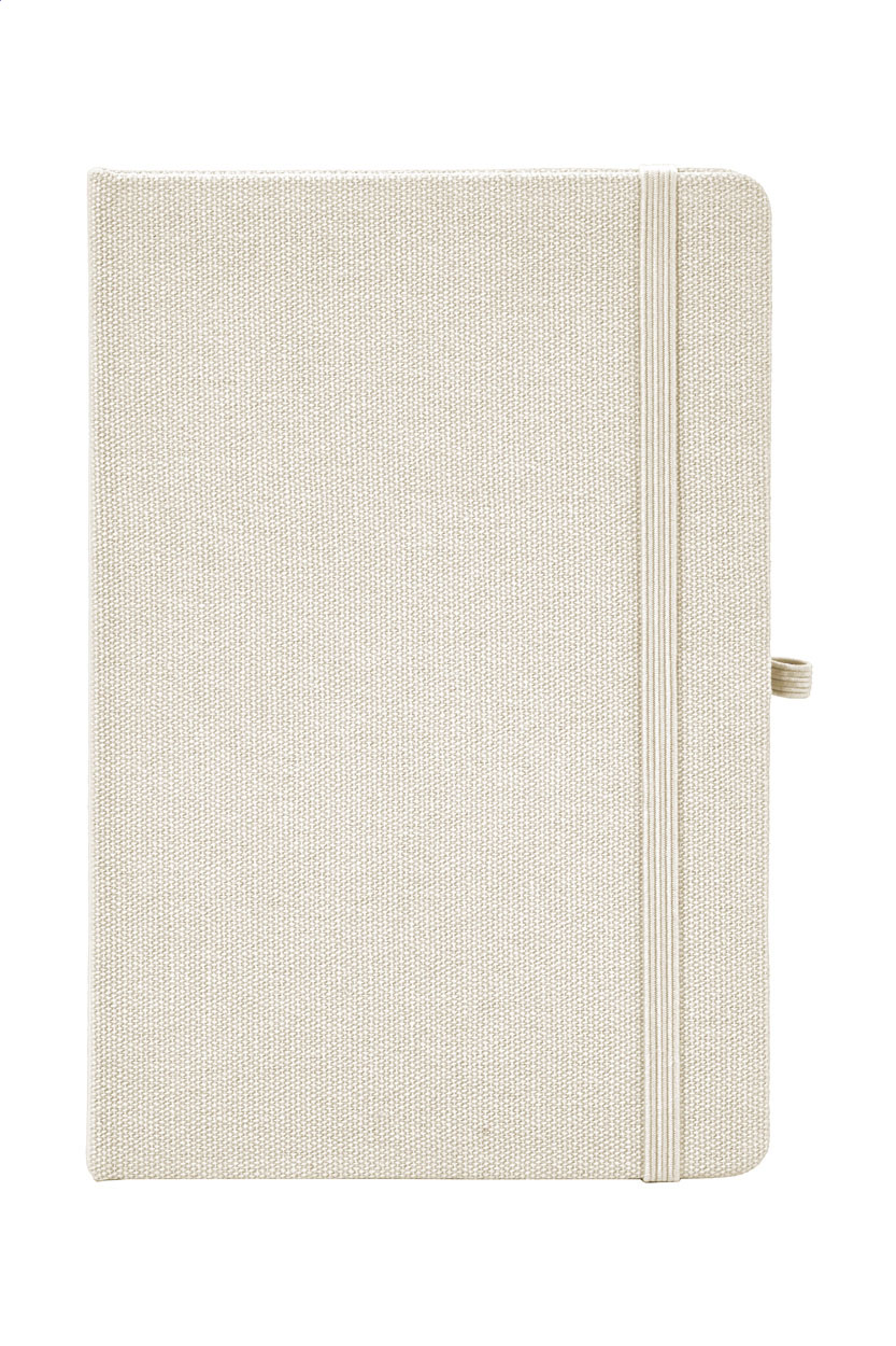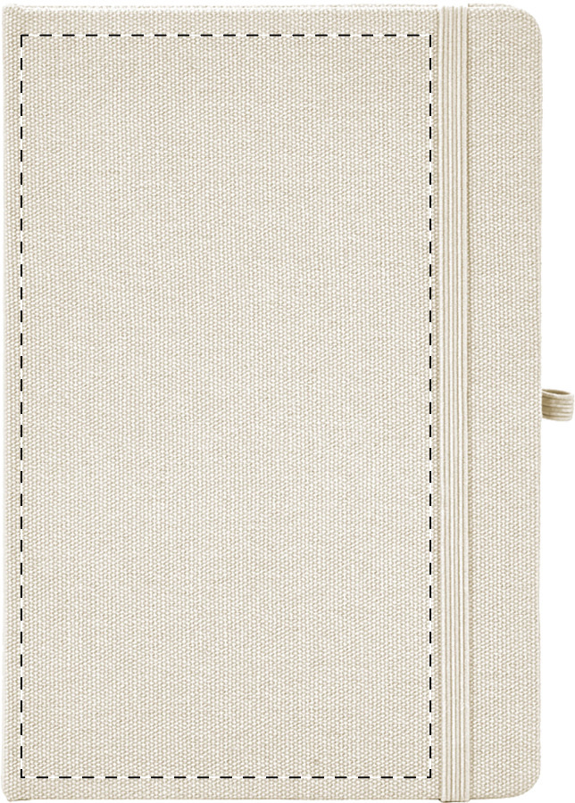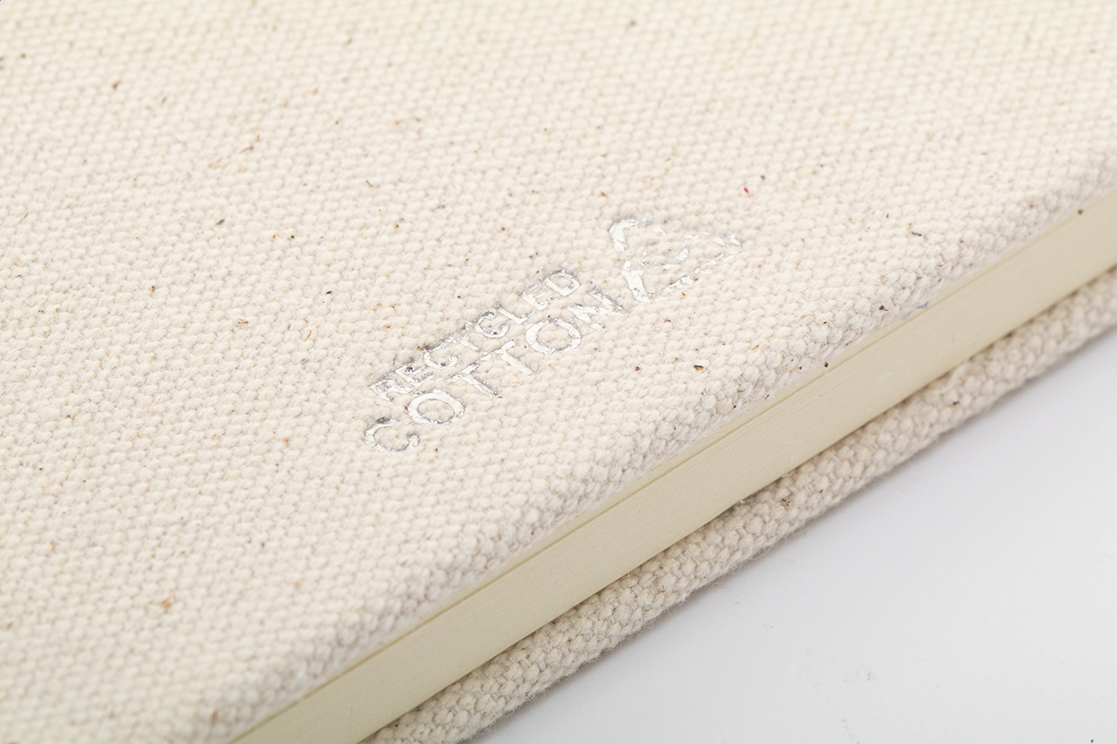 Blok potažený recyklovanou bavlnou s 80 linkovanými listy z recyklovaného papíru. Se záložkou v odpovídající barvě, gumičkou a držákem na pero. Velikost A5.