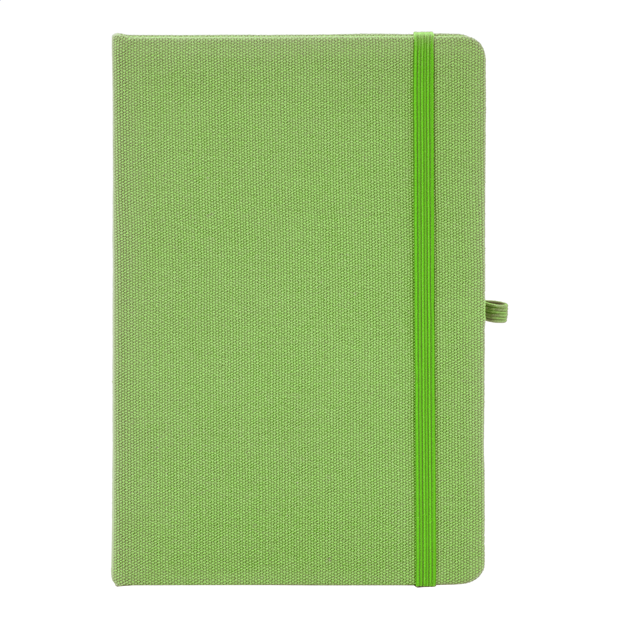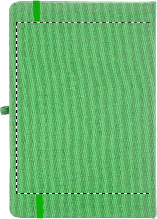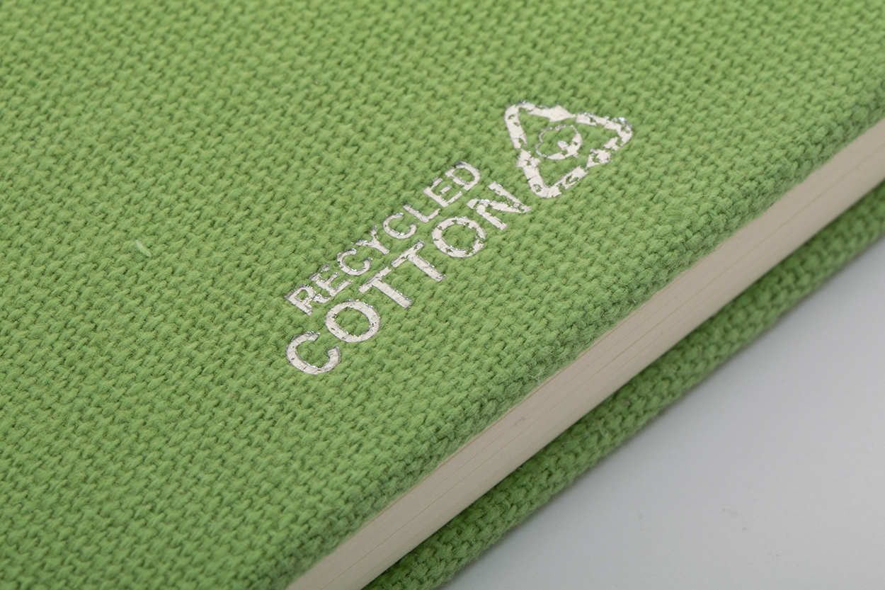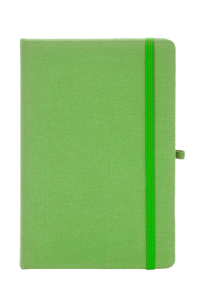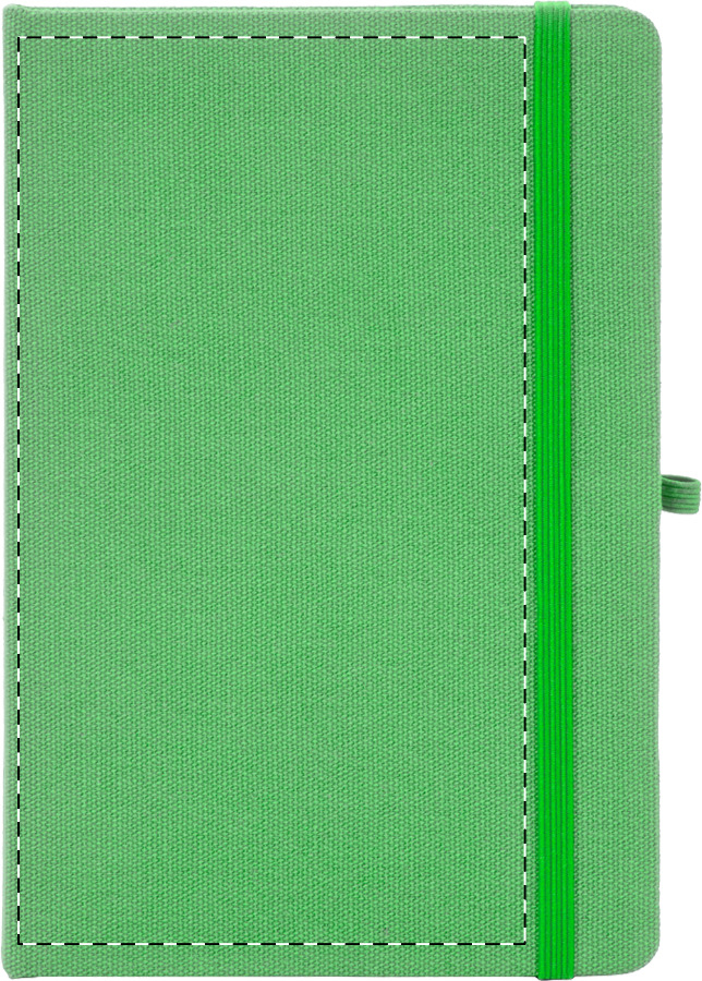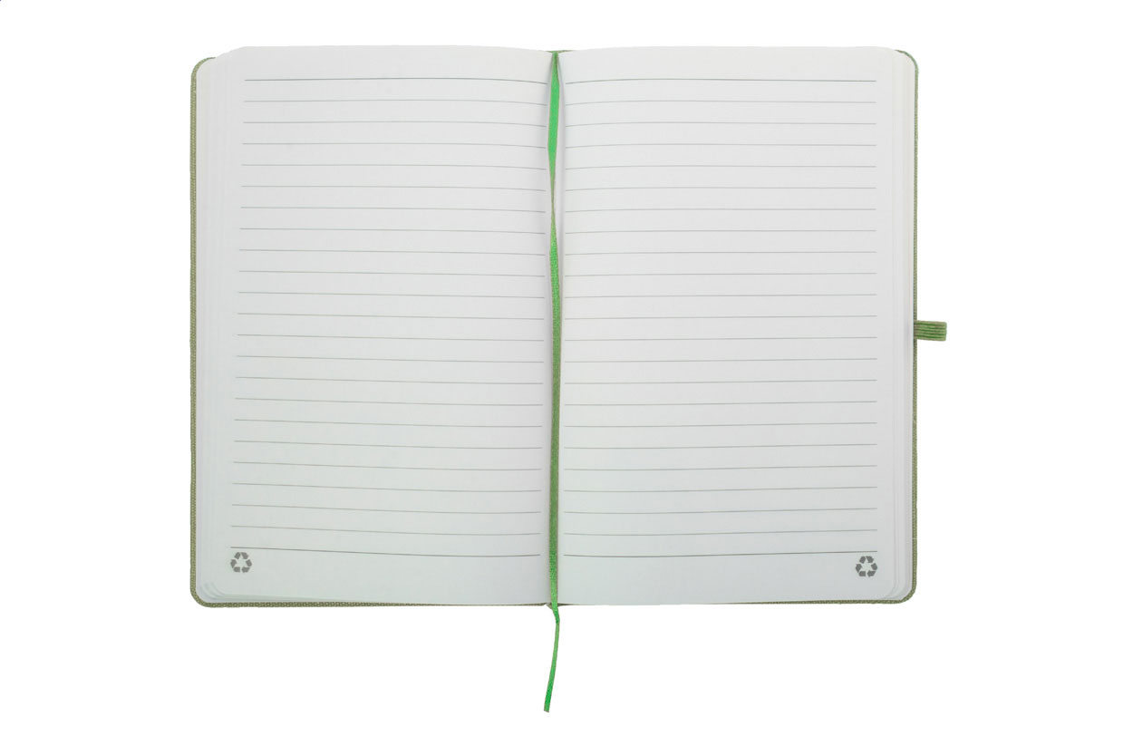Blok potažený recyklovanou bavlnou s 80 linkovanými listy z recyklovaného papíru. Se záložkou v odpovídající barvě, gumičkou a držákem na pero. Velikost A5.