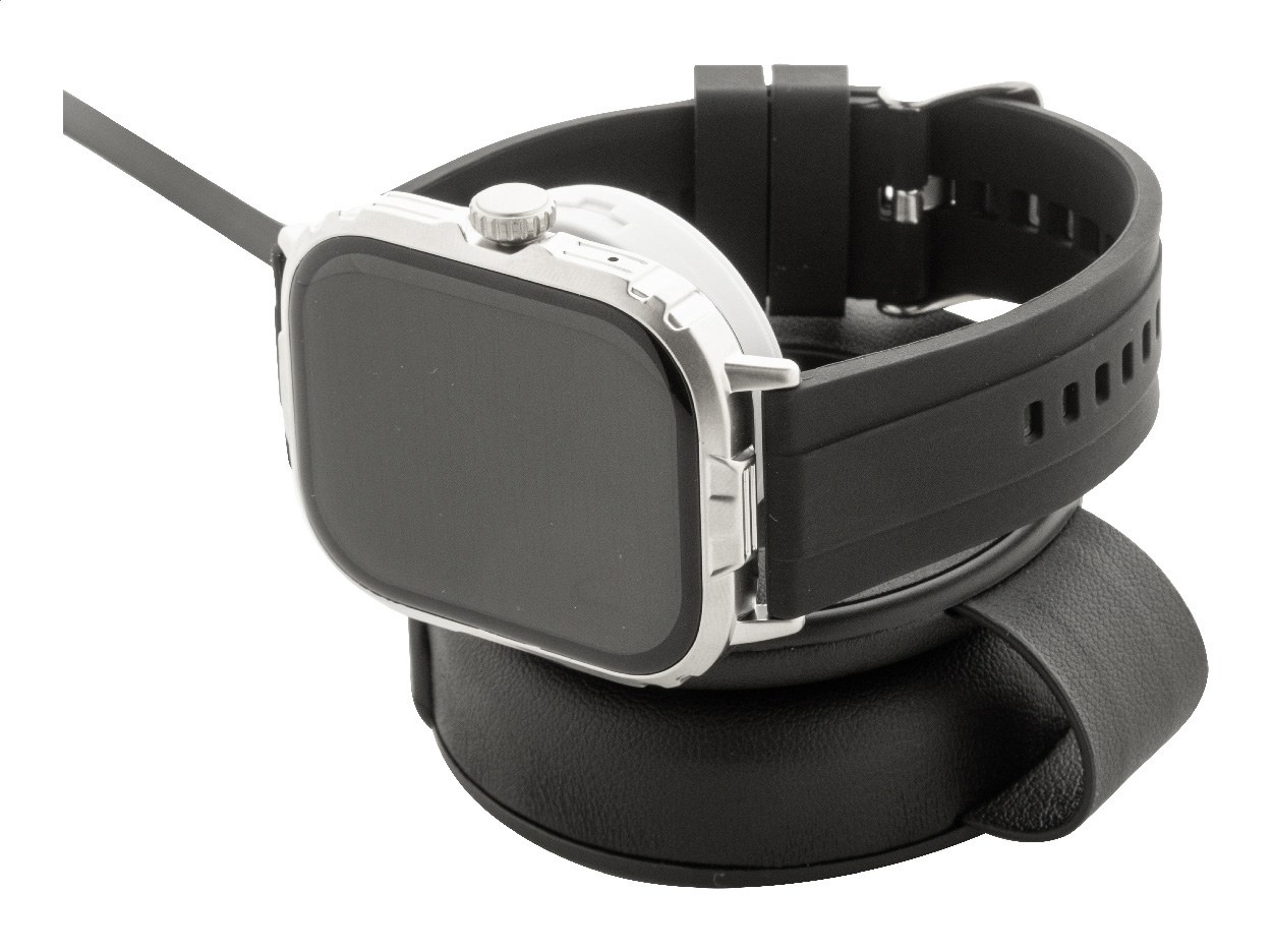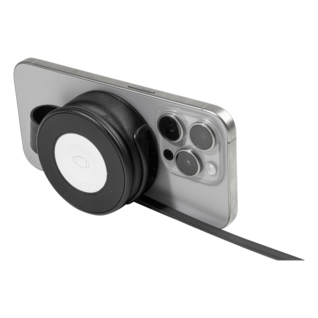 Luxusní skládací bezdrátová nabíjecí sada z recyklované PU kůže s magnetickou bezdrátovou rychlonabíječkou (15 W), sekundární bezdrátovou nabíječkou (2,5 W) pro chytré hodinky (Apple® a Samsung®) a vestavěným teleskopickým nabíjecím kabelem USB-C. Včetně samolepicího kovového kroužku pro použití magnetické funkce na jakémkoli bezdrátově nabíjecím zařízení. Kompatibilní s iPhone® 12 nebo novějším.