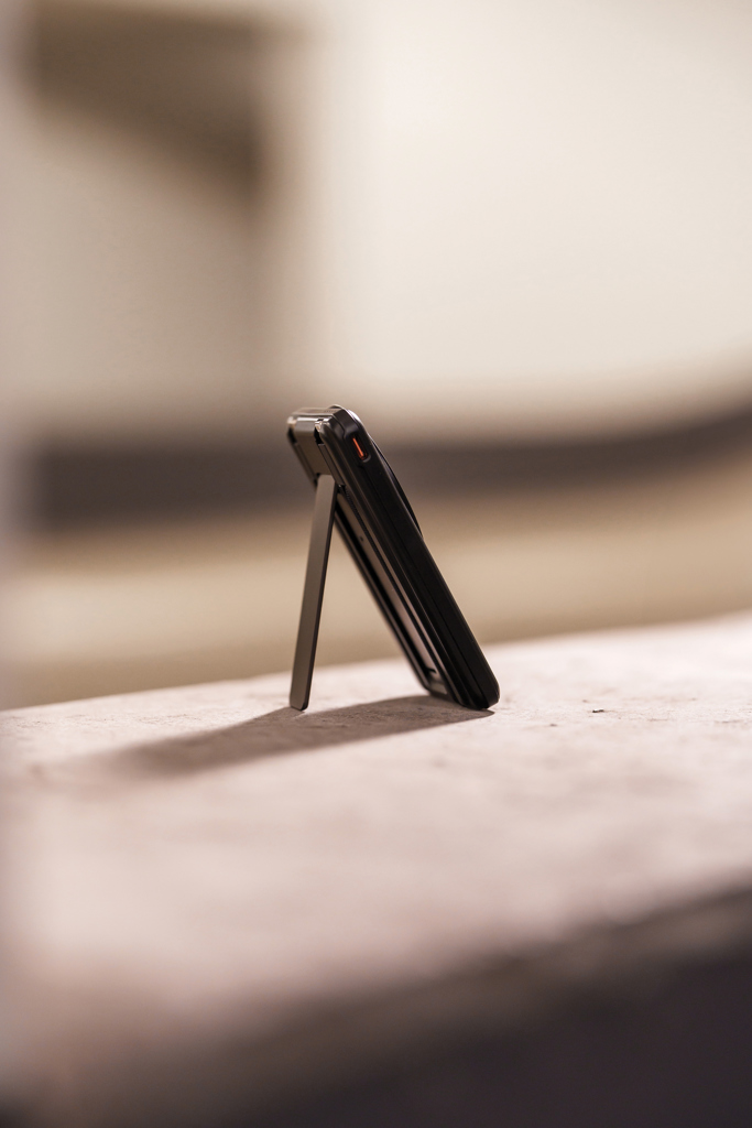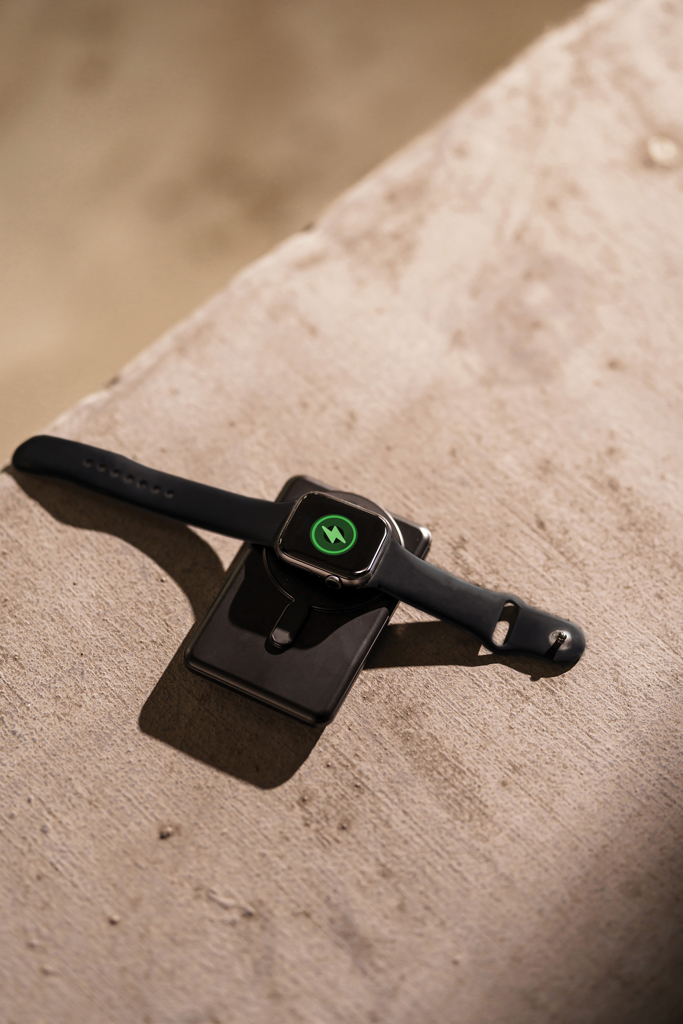Tenká magnetická powerbanka v černé barvě spojuje pět funkcí pro efektivní doplňování energie na cestách. Umožňuje 15W bezdrátové nabíjení kompatibilní s technologií MagSafe pro telefony, sluchátka AirPods i hodinky Apple Watch.