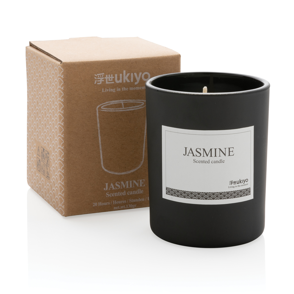 Malá vonná svíčka Ukiyo pro příjemné provonění domova a navození útulné atmosféry. Svíčka je v elegantní sklenici. Jasmínová vůně.