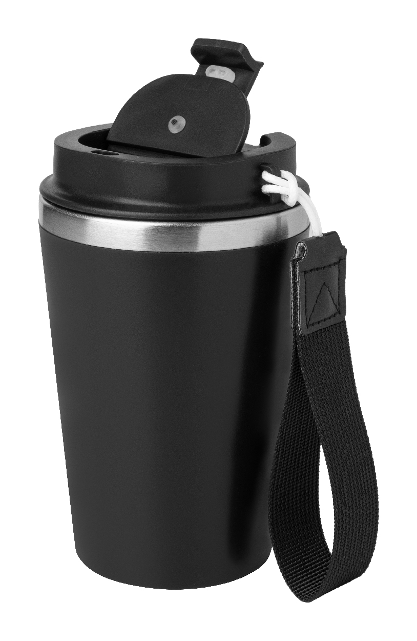 Dvoustěnný termo hrnek z recyklované nerezové oceli s vnějším PP plastem a víčkem na pití. S popruhem na přenášení RPET. 350 ml.