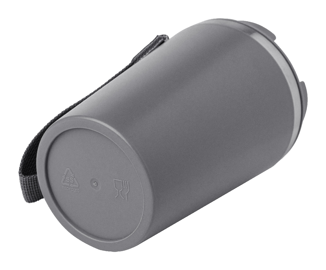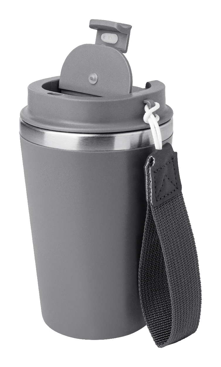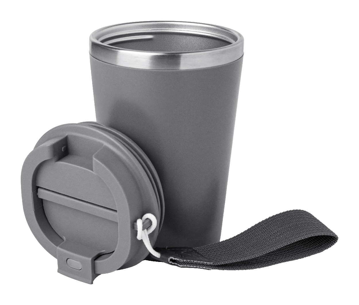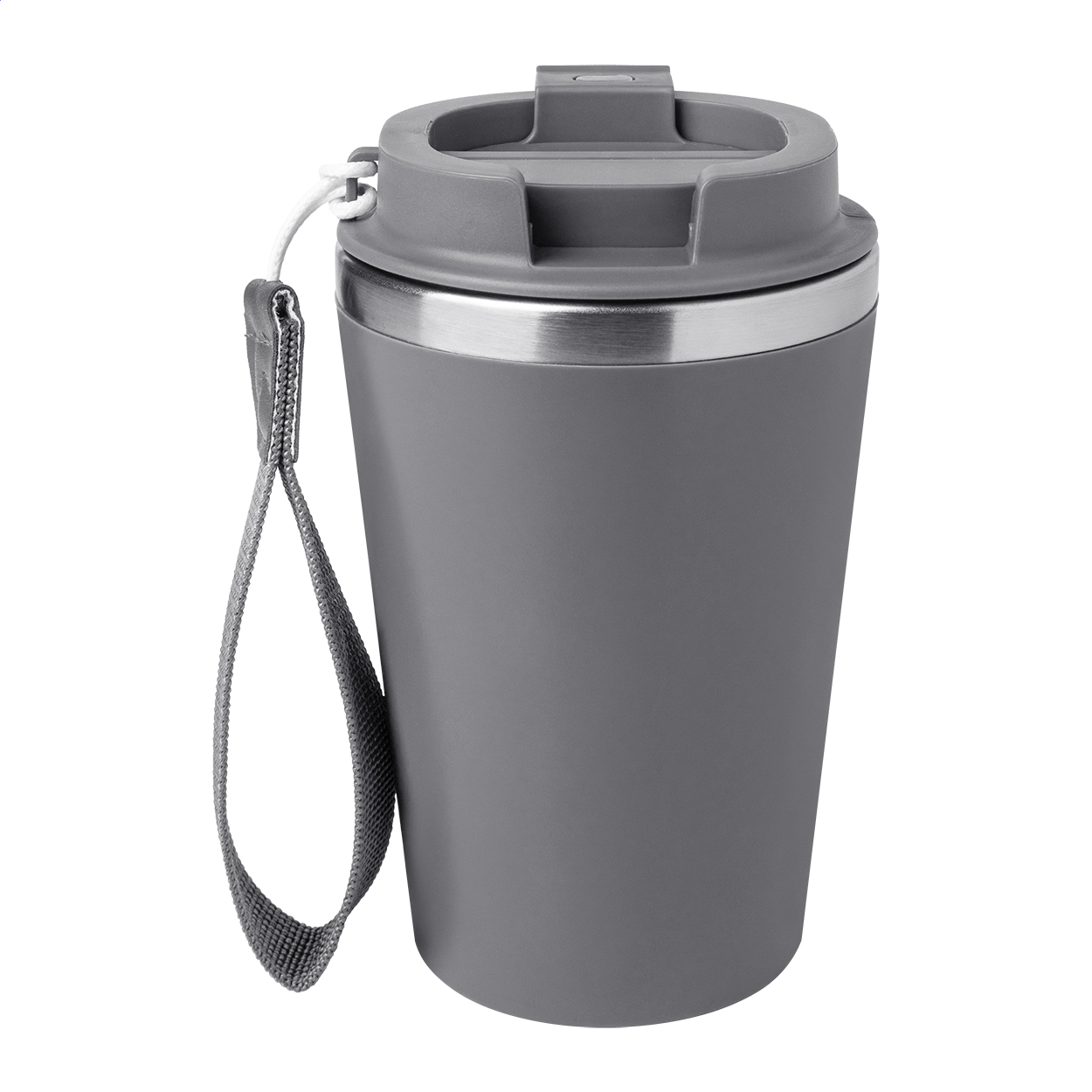 Dvoustěnný termo hrnek z recyklované nerezové oceli s vnějším PP plastem a víčkem na pití. S popruhem na přenášení RPET. 350 ml.