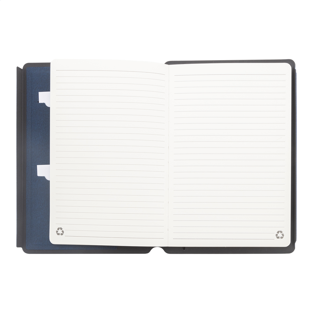 Sloha A5 na dokumenty z recyklované PU kůže s vnitřními kapsami na organizér a magnetickým zavíráním. Se 64 linkovanými listy poznámkového bloku z recyklovaného papíru.