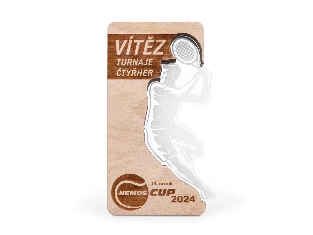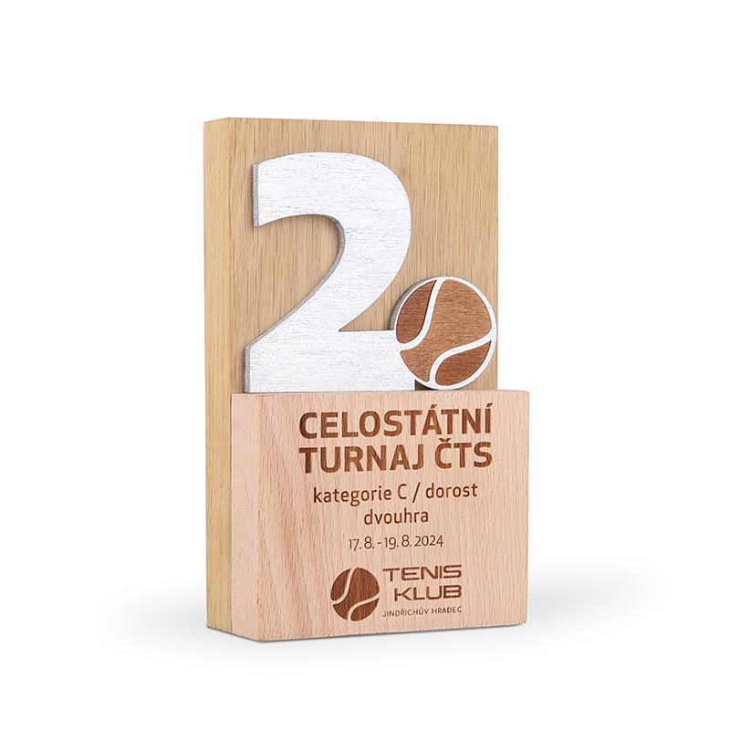 Tato originální trofej propojuje přirozený vzhled dřeva s moderní elegancí akrylátu a vytváří ocenění, které vynikne na každém sportovním vyhlášení. Dynamická silueta sportovce na boční hraně dodává trofeji energii a originalitu, ideální pro turnaje, soutěže i teambuildingy. Ekologická alternativa k plastu: Vyráběná z vrstvené překližky a recyklovatelného akrylátu, představuje tato trofej šetrnější řešení bez kompromisů v kvalitě. Díky lokální výrobě a využití odpovědně získaných materiálů minimalizuje ekologickou stopu. Materiály, které zaujmou: Základ z pevné překližky zajišťuje stabilitu, zatímco průhledný akrylát vsazený mezi vrstvy nabízí ideální plochu pro precizní gravírování. Výsledkem je efektní kontrast a profesionální dojem. Moderní design s osobností: Silueta sportovce, například tenisty, běžce nebo cyklisty, na pravém okraji je pečlivě vyřezaná laserem a podtrhuje tematiku ocenění. Kombinace tvarů a materiálů dělá z této trofeje nepřehlédnutelný prvek. Přizpůsobení bez příplatku: Součástí ceny je kompletní personalizace, od volby motivu a textu až po přesný sportovce. Každá trofej vzniká na zakázku podle vašich přání a potřeb. Česká výroba s důrazem na kvalitu: Každý kus je ručně zpracován v České republice, s důrazem na detail a poctivé řemeslo. Podporou lokální produkce přispíváte k rozvoji domácí ekonomiky a udržitelného podnikání. Vyberte tuto trofej jako stylové a odpovědné ocenění, které si vaši sportovci opravdu zaslouží.