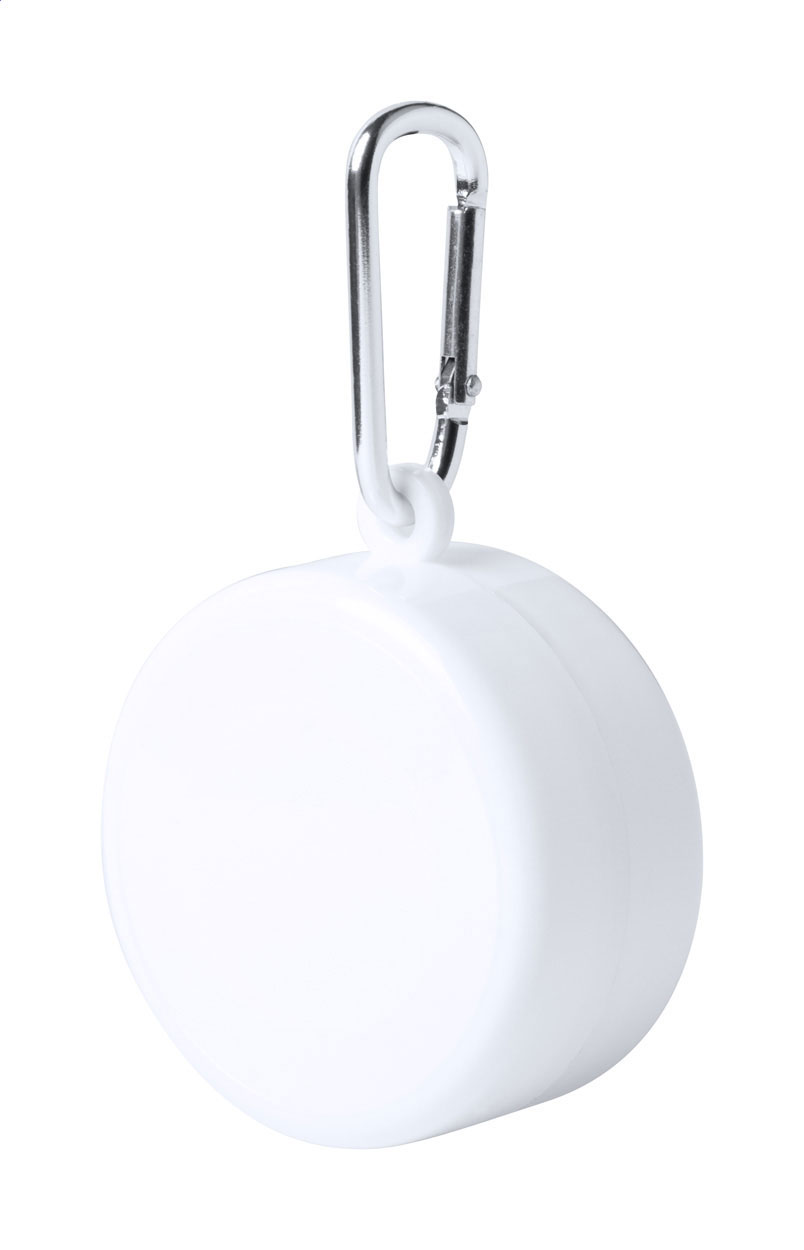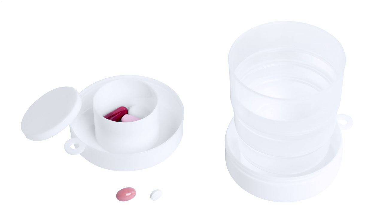 Plastový skládací pohárek s boxem na pilulky. Pouzdro s karabinkou. Objem 220 ml.