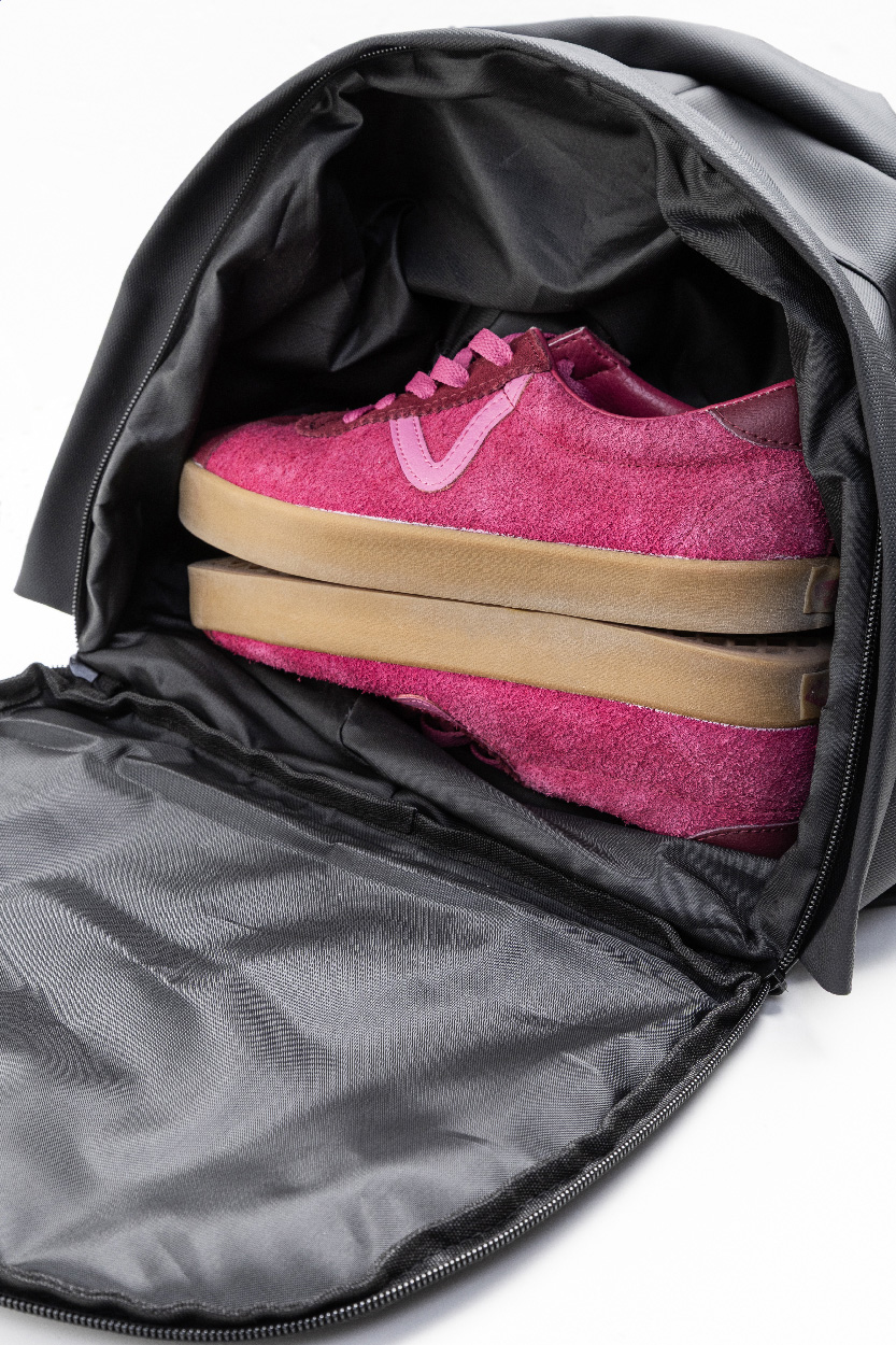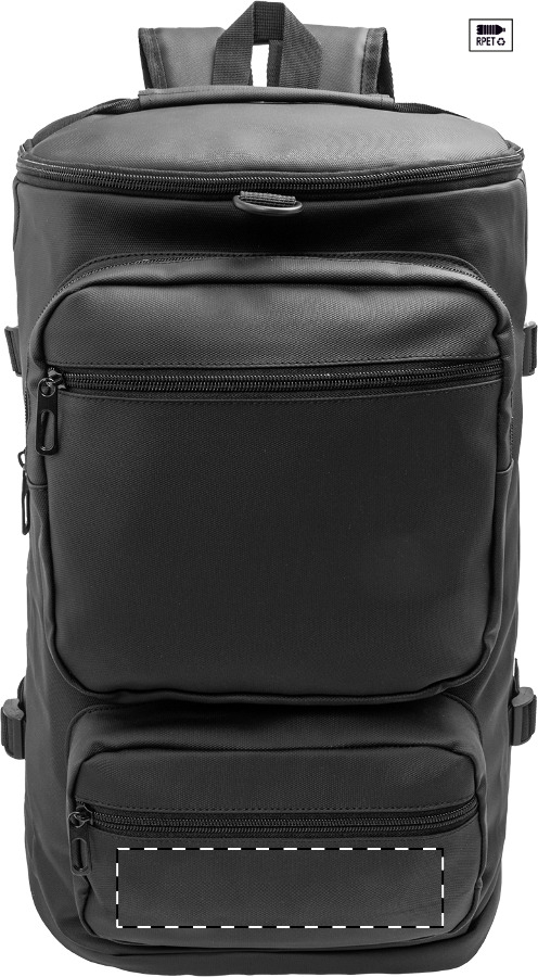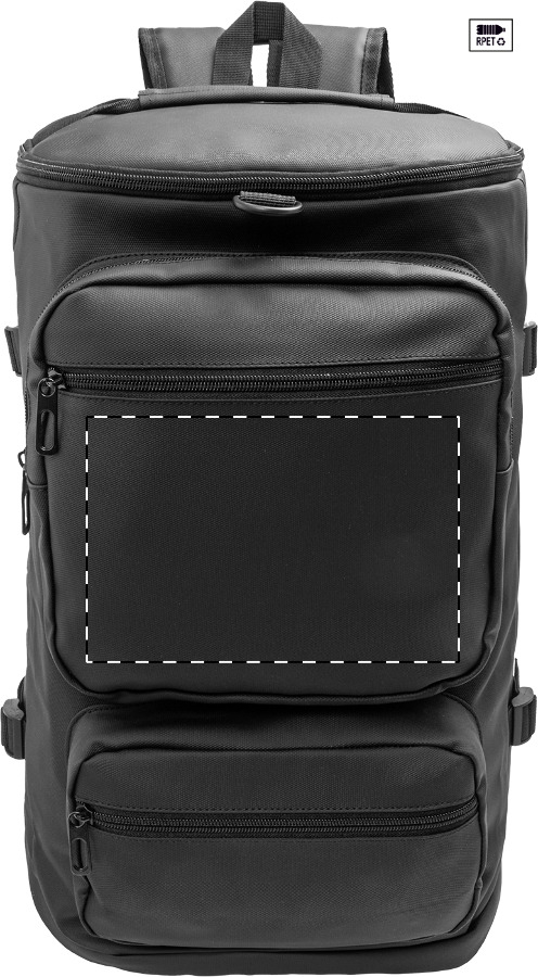 Nepromokavý batoh z RPET s hlavní přihrádkou na zip, 2 předními kapsami na zip, bočními kapsami a přihrádkou na boty na zip. S polstrovanou přihrádkou na notebook (15"), polstrovanými zády a ramenními popruhy. S bočními popruhy s možností nastavení velikosti. 600D RPET polyester s PU povrchem a výraznou nálepkou RPET.
