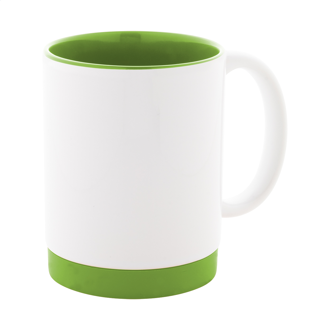 Keramický hrnek na sublimaci s barevným vnitřkem a silikonovým kroužkem v odpovídající barvě, 300 ml. V bílé papírové krabici.