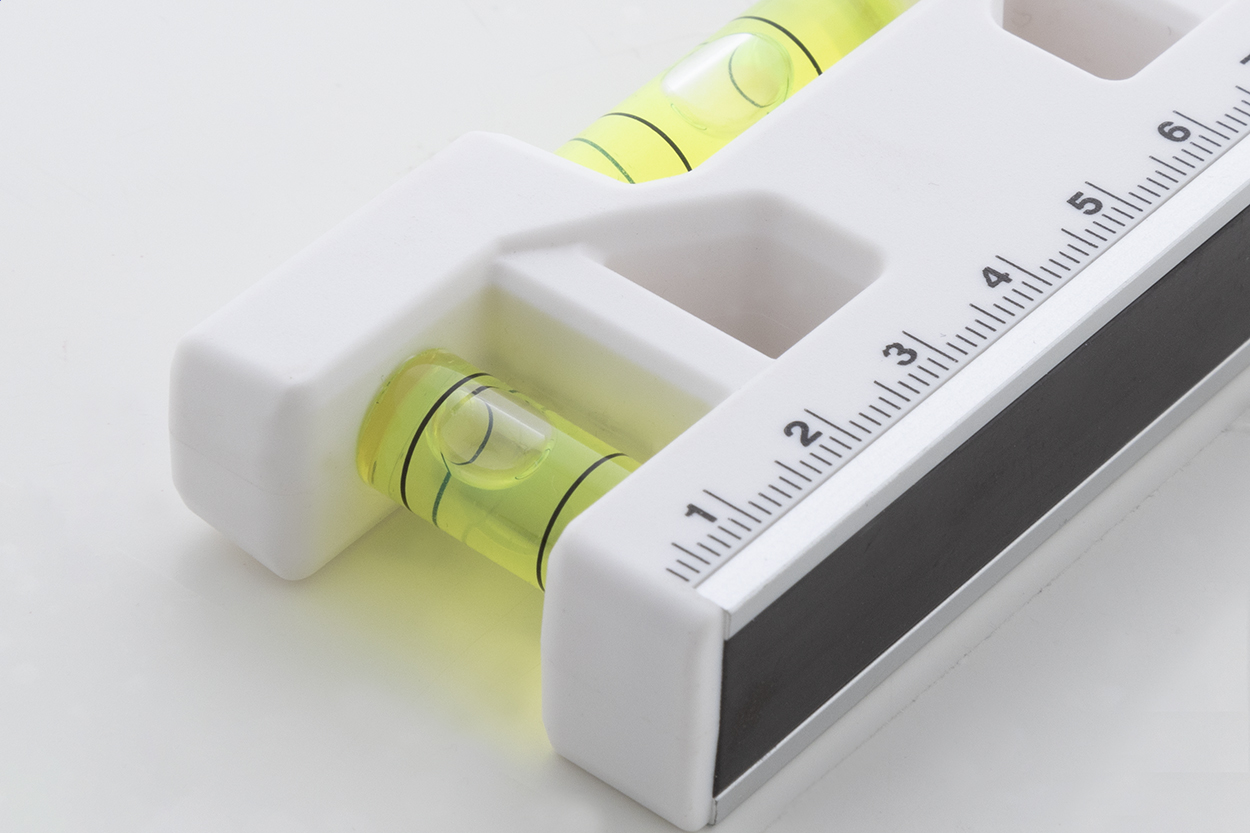 Multifunkční přívěšek na klíče z recyklovaného ABS s kovovým kroužkem, pravítkem, magnetem a dvojitou vodováhou.