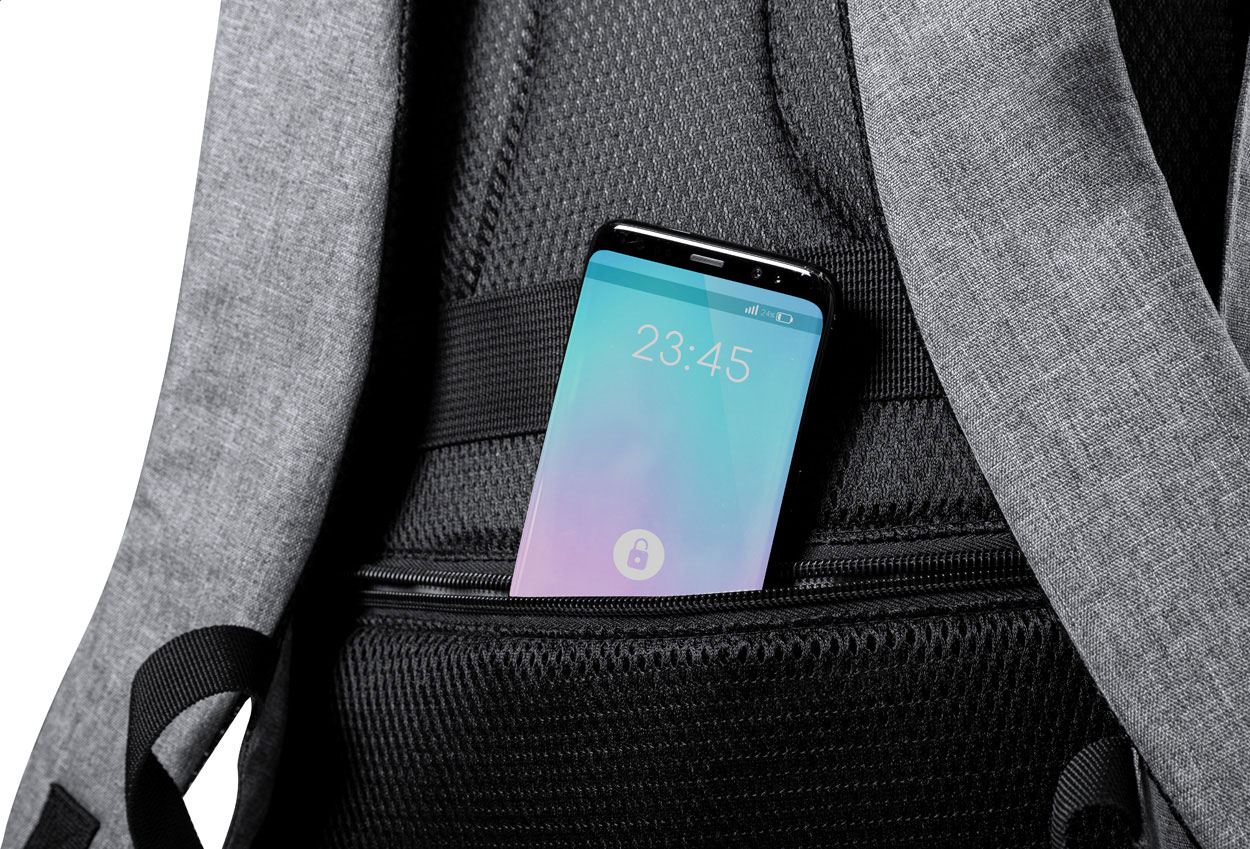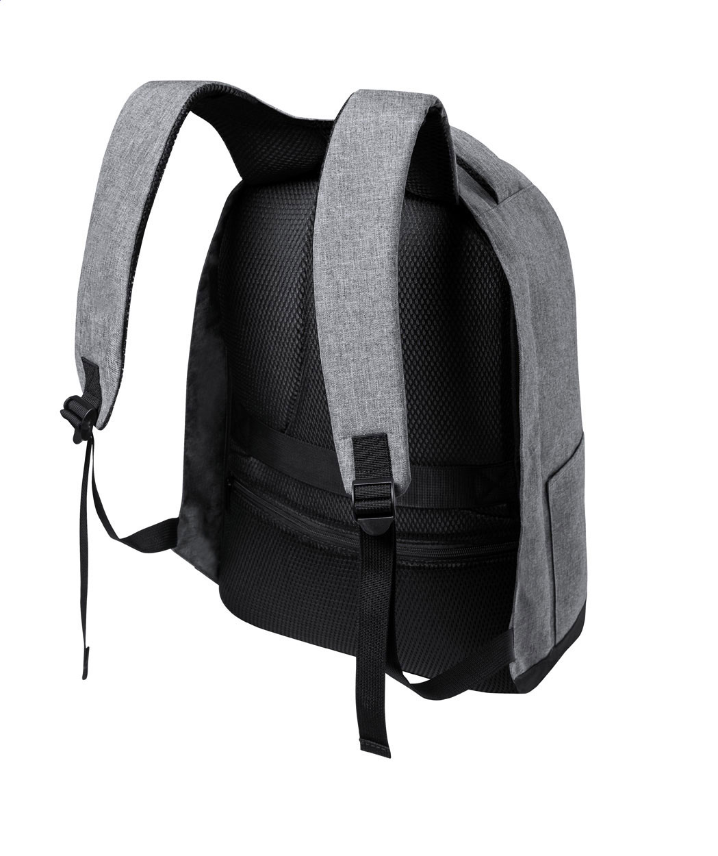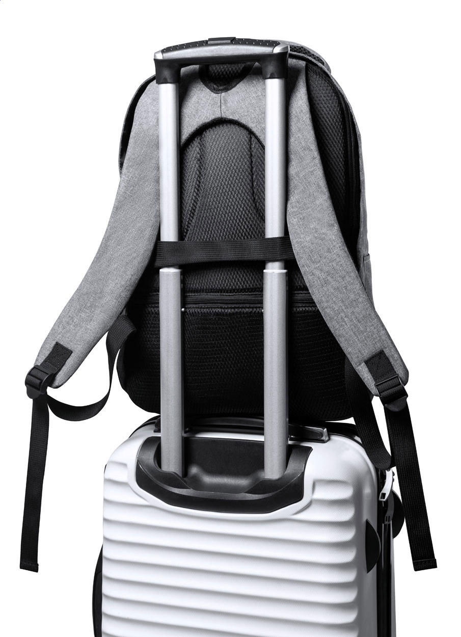 Batoh s přihrádkami na zip, polstrovanou přihrádkou na 15palcový notebook a 12palcový tablet, popruhem na madla kufru na kolečkách, ergonomickými zády a ramenními popruhy. Se skrytou kapsou proti krádeži. Vyrobeno z 600D RPET (recyklovaný PET) polyester.