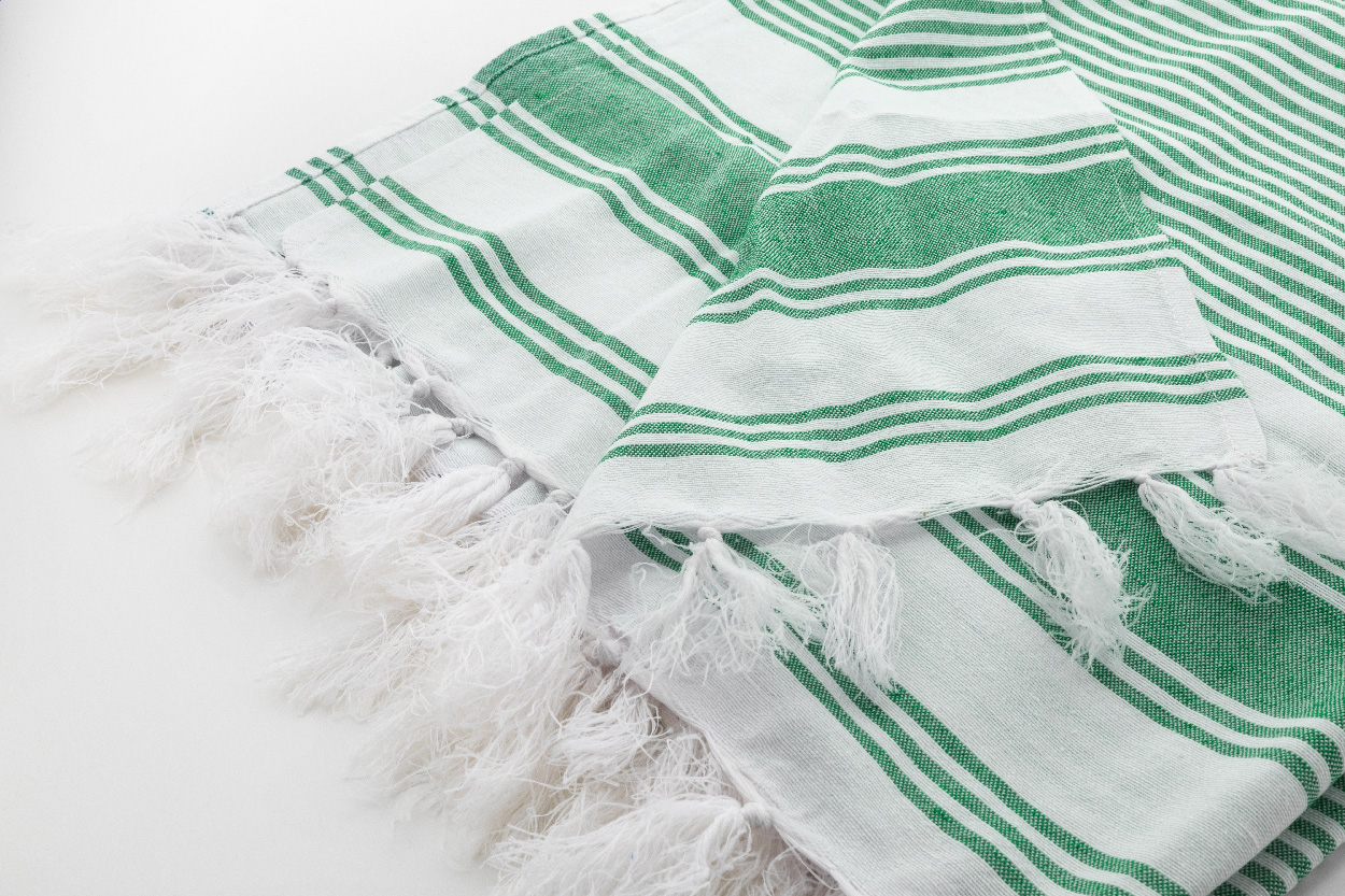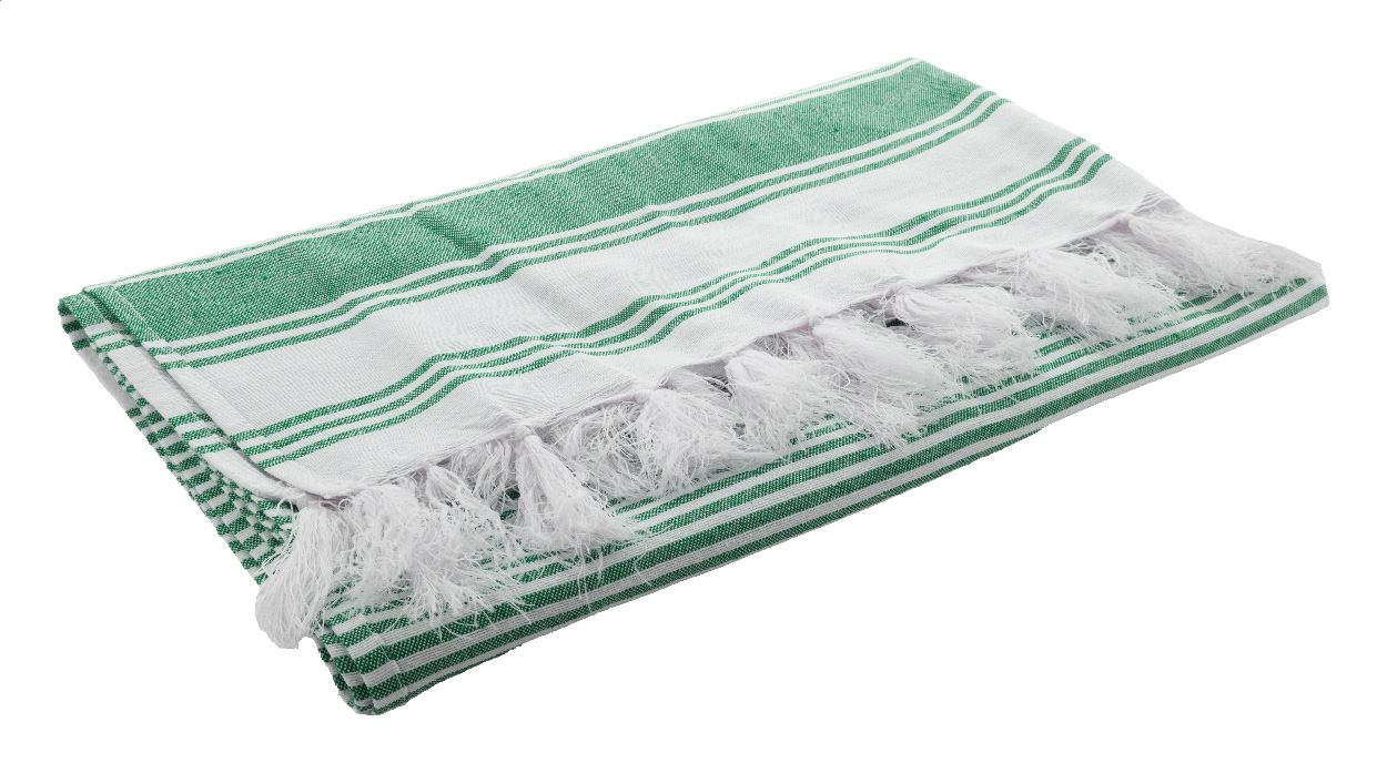 Dvoubarevný pruhovaný plážový ručník pareo ze 70% bavlny a 30% polyesteru. 210 g/m².