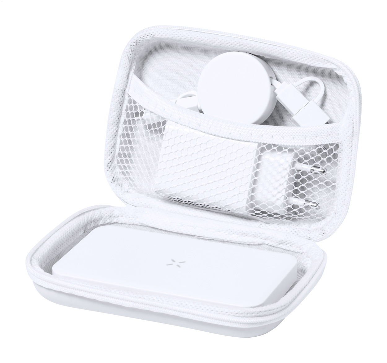 Sada USB nabíječky v pouzdře z PU kůže na zip. Obsahuje powerbanku s vestavěnou bezdrátovou nabíječkou (5W) a 4000 mAh baterií, teleskopický USB nabíjecí kabel s konektory micro USB, USB-C a Lightning, vstupy USB a USB-C. Rychle nabíjecí USB nástěnná nabíječka s 1 USB a 1 USB-C portem.