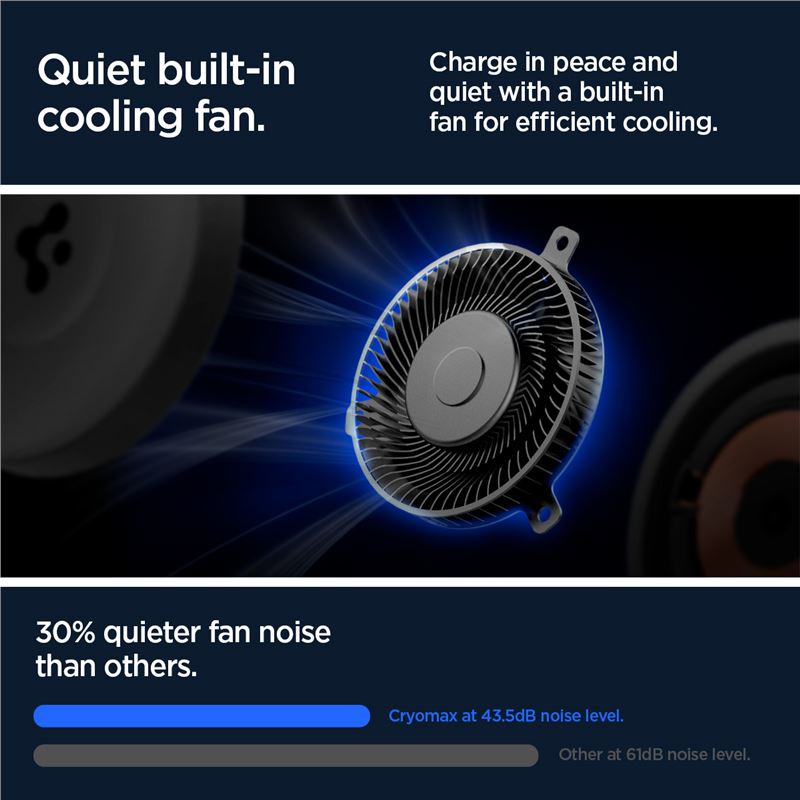 Aktivní chlazení CryoMax s vestavěným tichým ventilátorem efektivně odvádí teplo a chrání baterii před přehřátím během rychlého nabíjení. Jemné LED podsvícení signalizuje aktivní připojení a polykarbonátová konstrukce dodává interiéru moderní vzhled.
