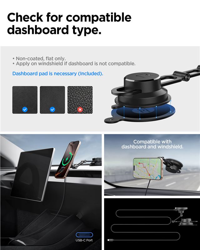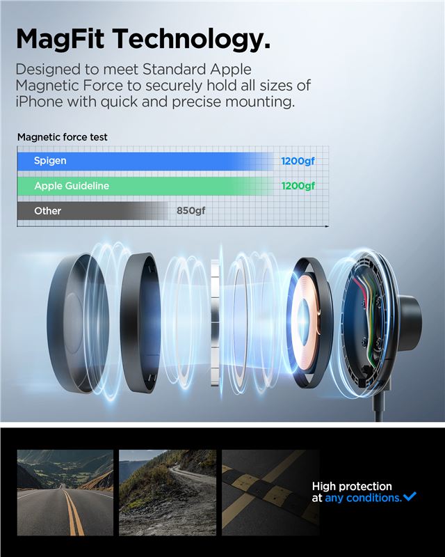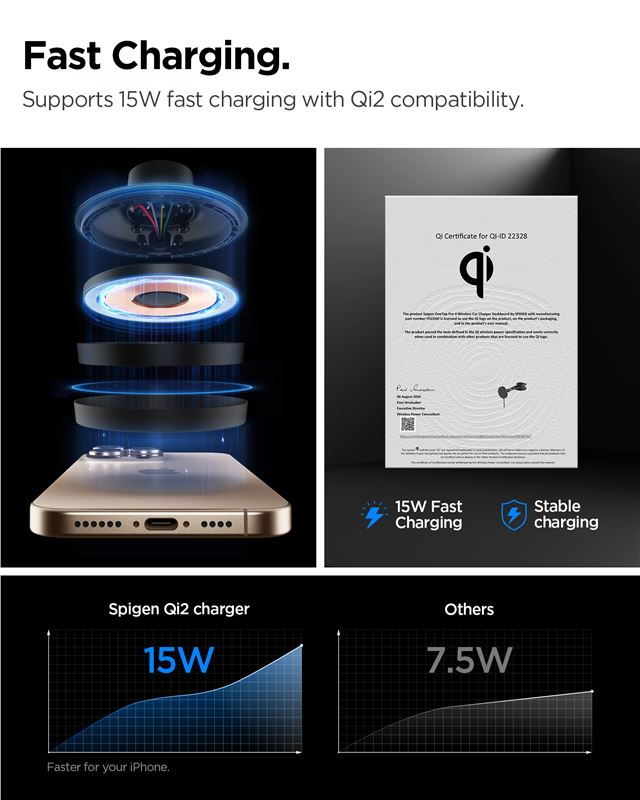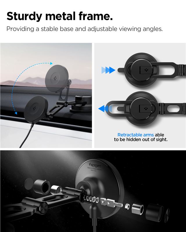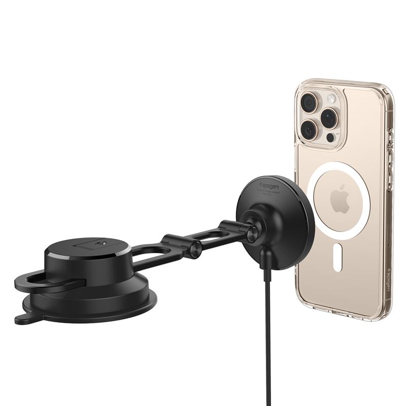 Bezdrátová nabíječka Spigen OneTap Pro 4 MagSafe určená pro palubní desku nebo čelní sklo zajistí rychlé 15W dobíjení iPhone. Silná přísavka drží konstrukci z kovu a polykarbonátu spolehlivě na zvoleném místě i během prudkých manévrů.