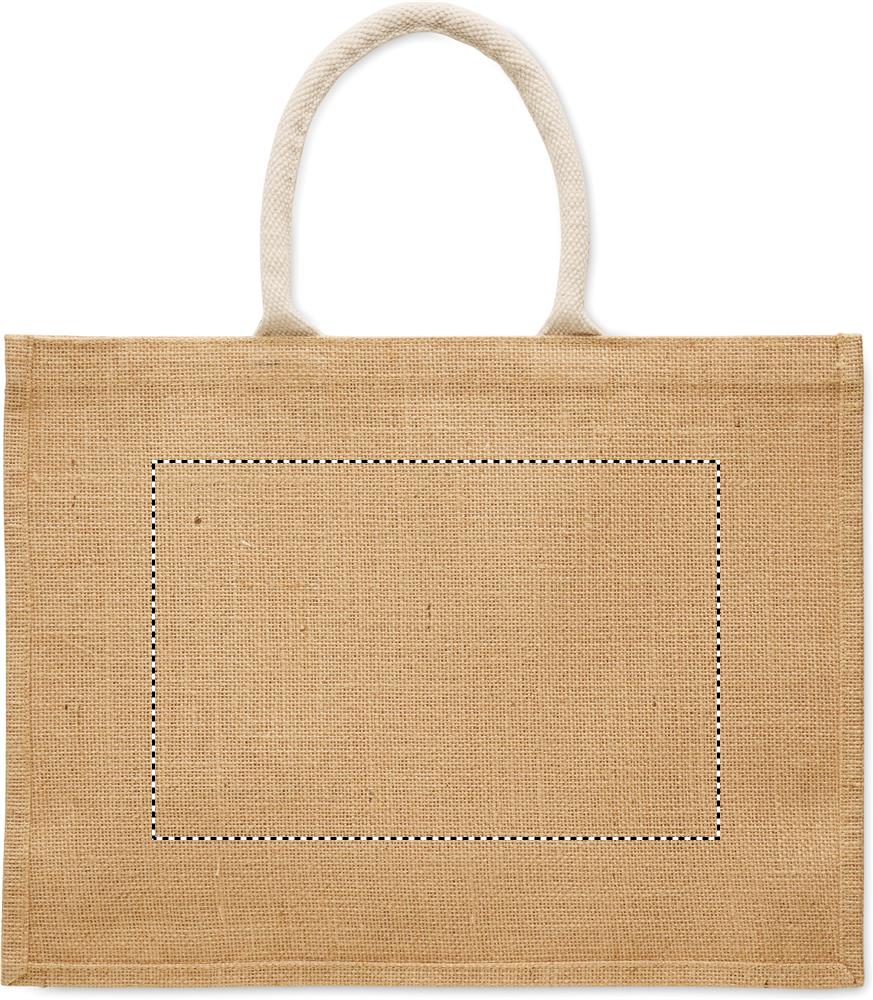 Nákupní taška z laminované juty a bavlněného 280 g plátna. Provazová ucha. Velkoá otevřená přední kapsa.