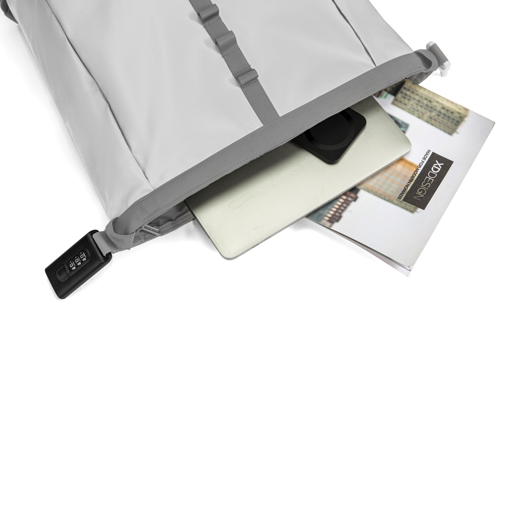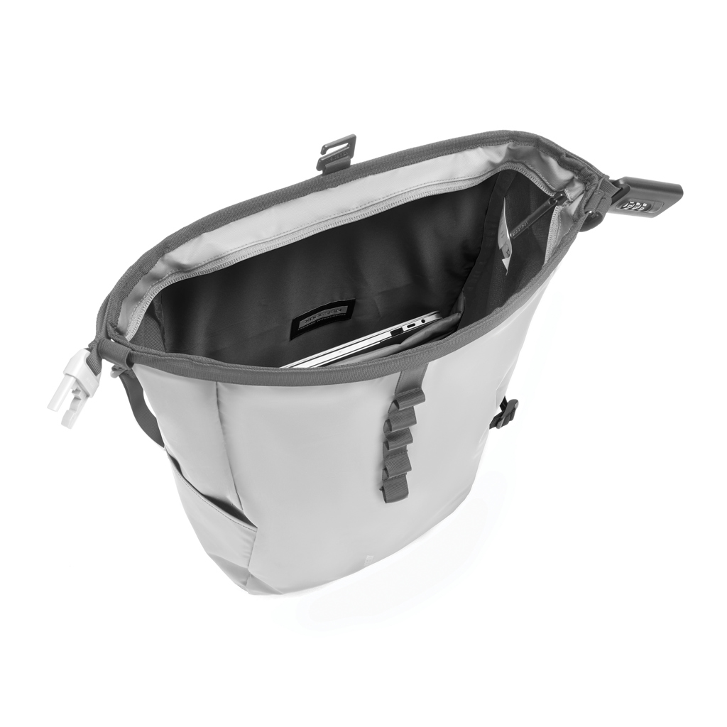 Nový městský batoh Urban proti krádeži je ideálním společníkem na cesty, zajišťující bezpečnost a pohodlí. Srolováním hlavní přihrádky a jejím zabezpečením pomocí zesíleného kombinovaného zámku batoh nabízí úplné uzavření, které lze také použít k uzamčení batohu kolem pevného objektu. Skryté kapsy na zadní straně. Batoh je vybaven boční kapsou na láhev s vodou. Uvnitř jsou polstrované přihrádky pro 16” laptop a síťové kapsy pro organizaci vašich nezbytností. Vyrobeno z látky s traceability Aware™ z recyklovaného polyesteru a povrchově upraveno měkkým voděodolným PU povlakem. Obsahuje 11 % recyklovaného materiálu. Registrovaný design®.