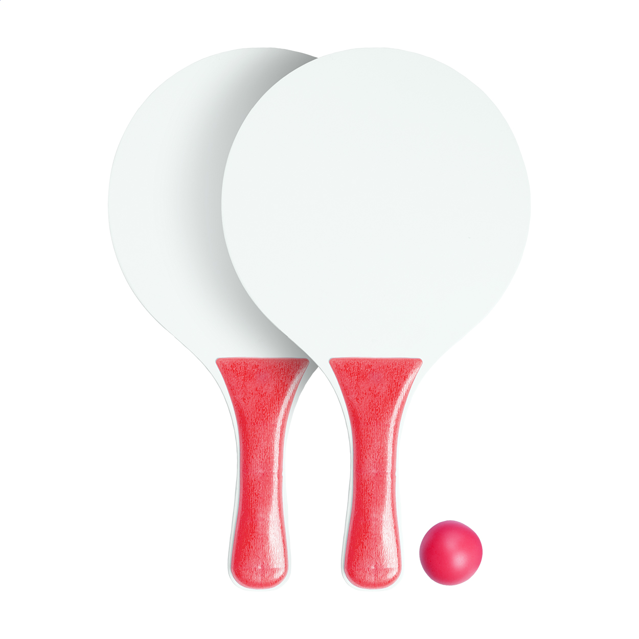 Set na plážový tenis se 2 dřevěnými pálkami a jedním plastovým míčkem.