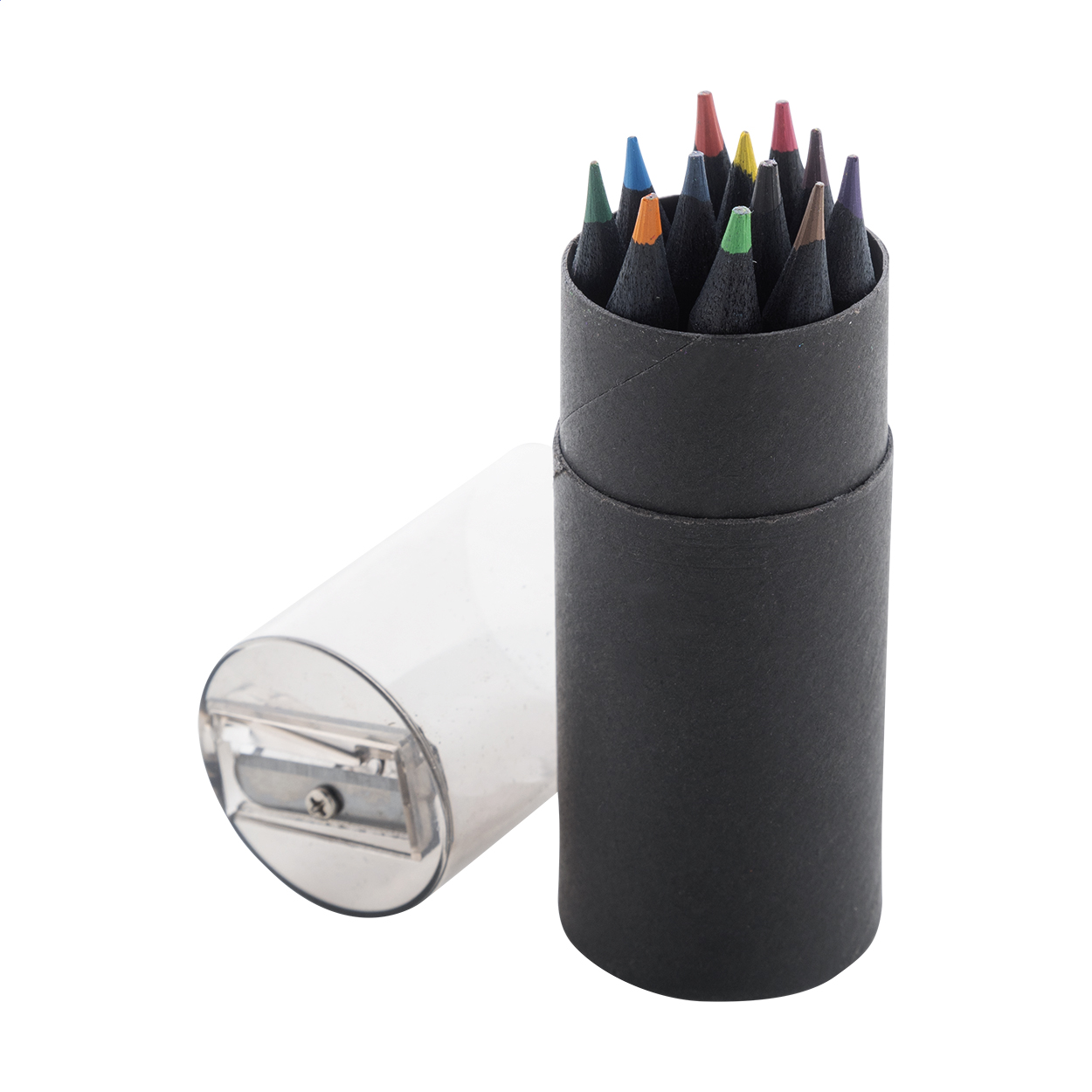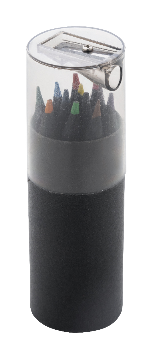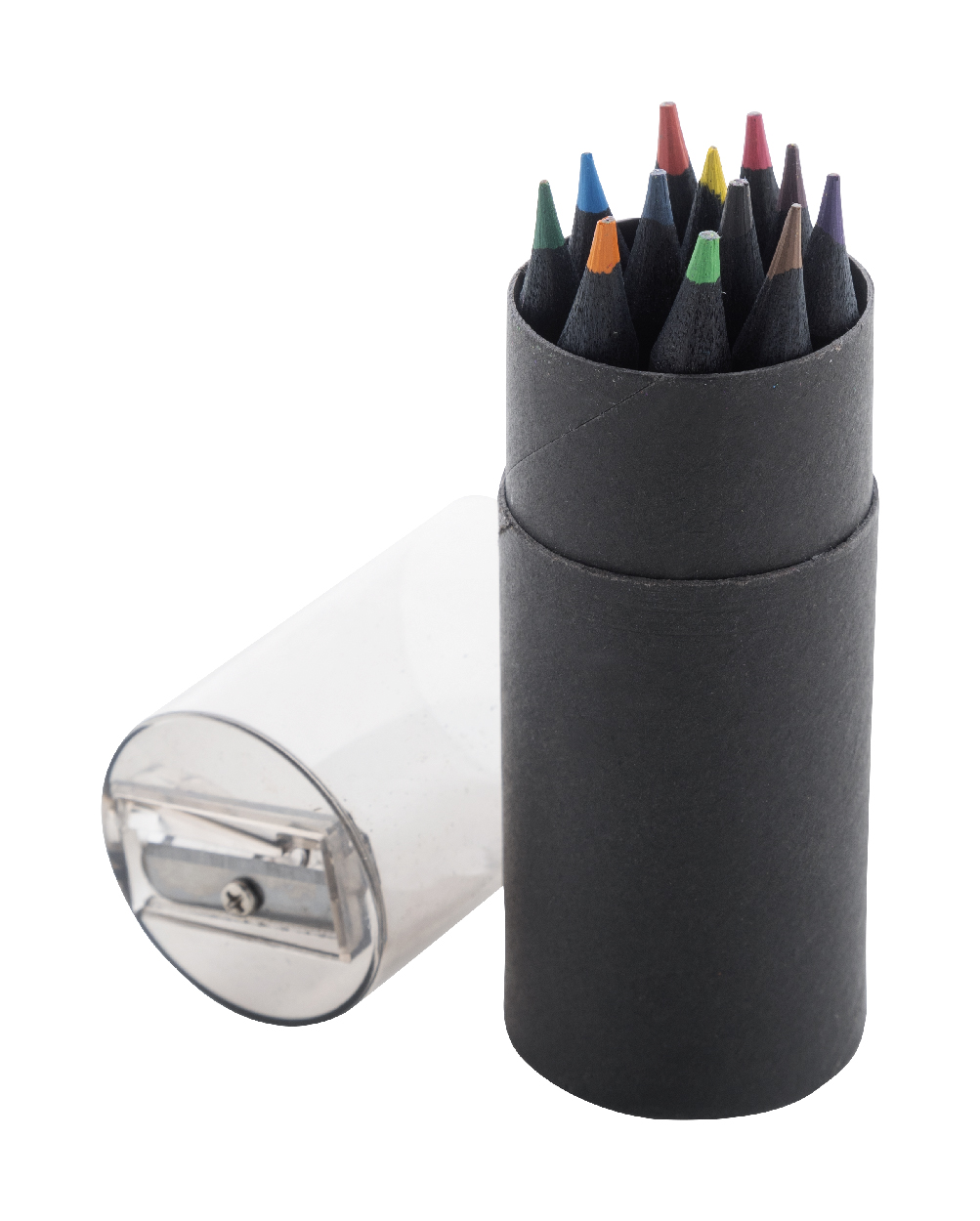 12dílná sada pastelek z černého dřeva v kulatém černém pouzdře z kartonu s plastovým ořezávátkem.