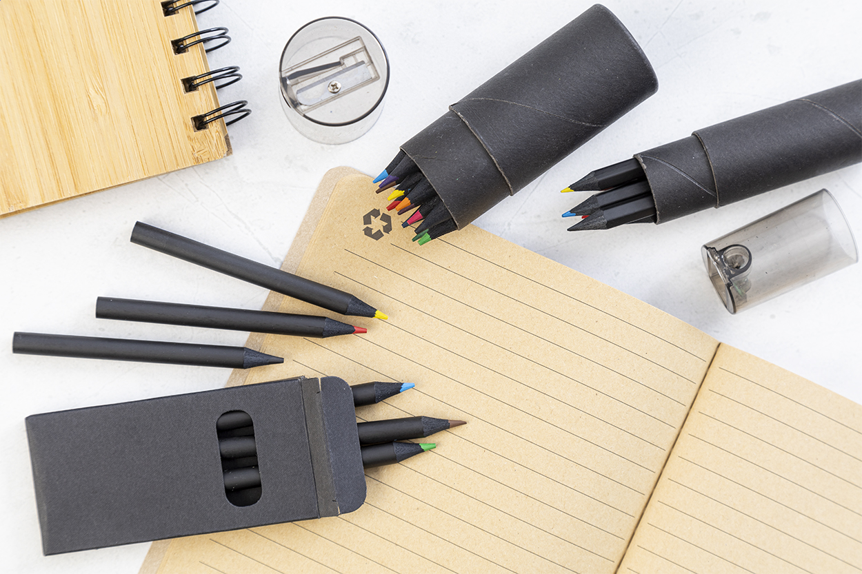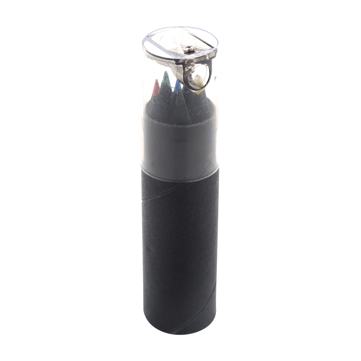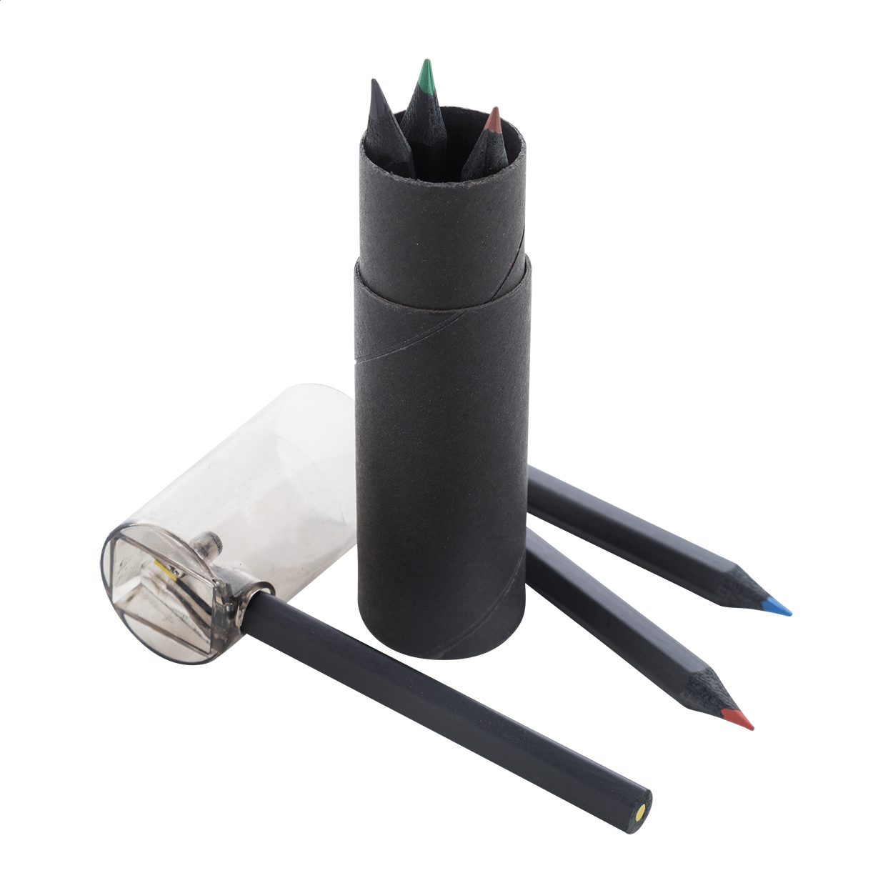 6dílná sada pastelek z černého dřeva v kulatém černém pouzdře z kartonu s plastovým ořezávátkem.