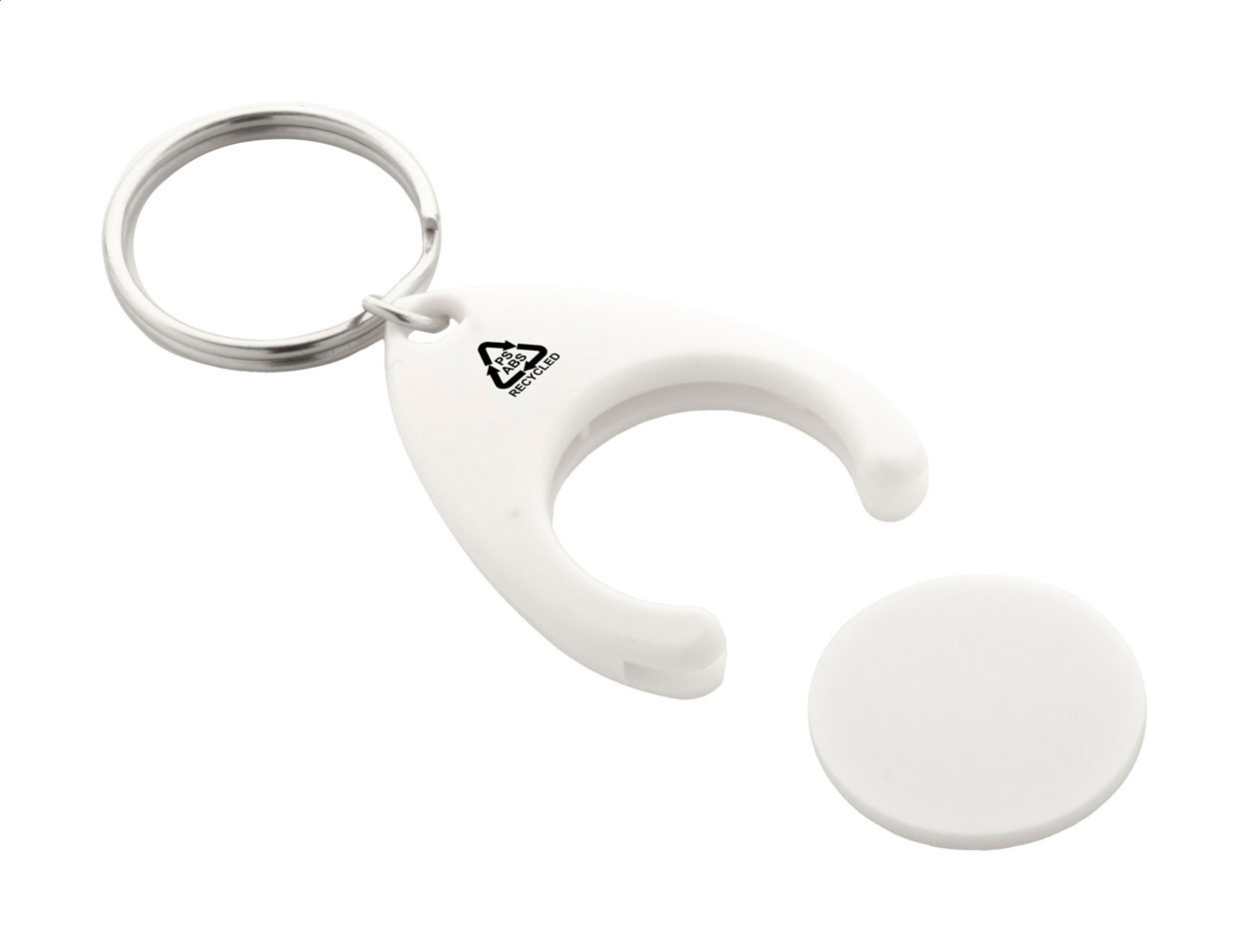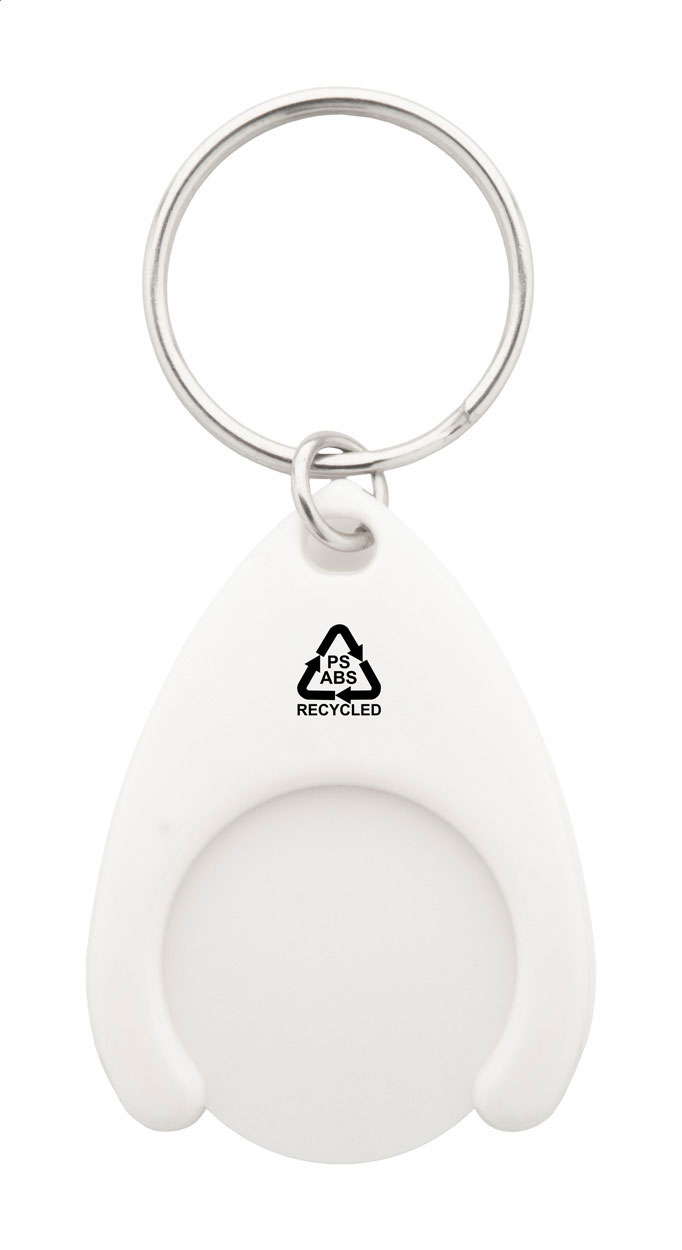 Přívěšek na klíče z recyklovaného ABS plastu s mincí do nákupního vozíku a kovovým kroužkem. Velikost mince: ø24×2 mm.