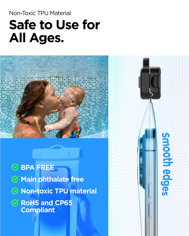 Využívá průhledný povrch reagující na dotyk, který dovoluje pohodlné ovládání displeje bez nutnosti vyjmutí zařízení. Pevné zámky se spolehlivě zaklapnou pro zamezení průniku vlhkosti a nastavitelný popruh usnadňuje manipulaci při plavání nebo jiných outdoorových aktivitách.