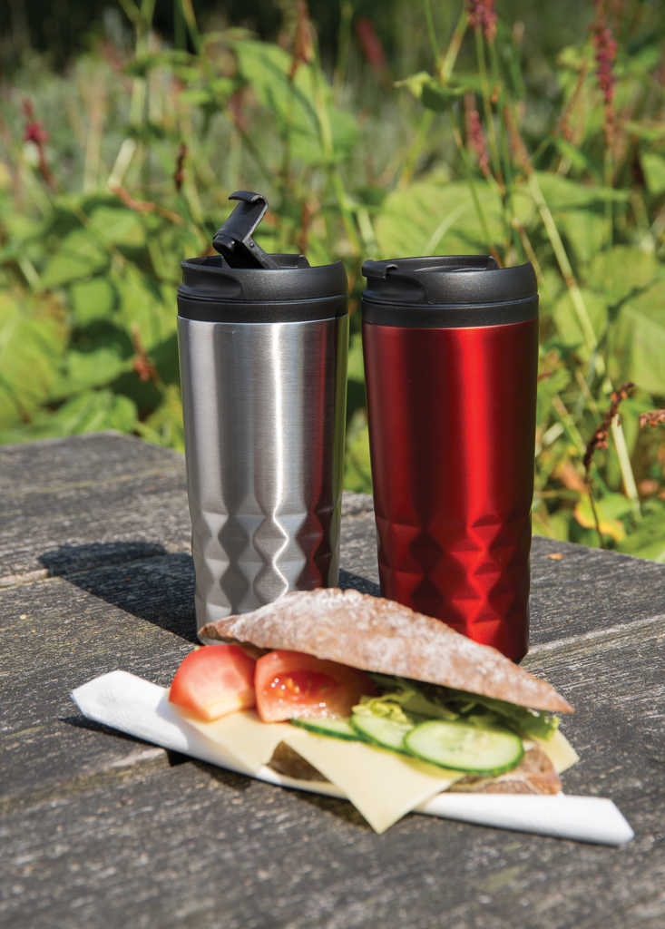 Zahrnuje odolné plastové víčko s posuvným mechanismem pro bezpečné a pohodlné pití. Kompaktní rozměr zajišťuje snadnou manipulaci a bezproblémové umístění do většiny nápojových držáků.