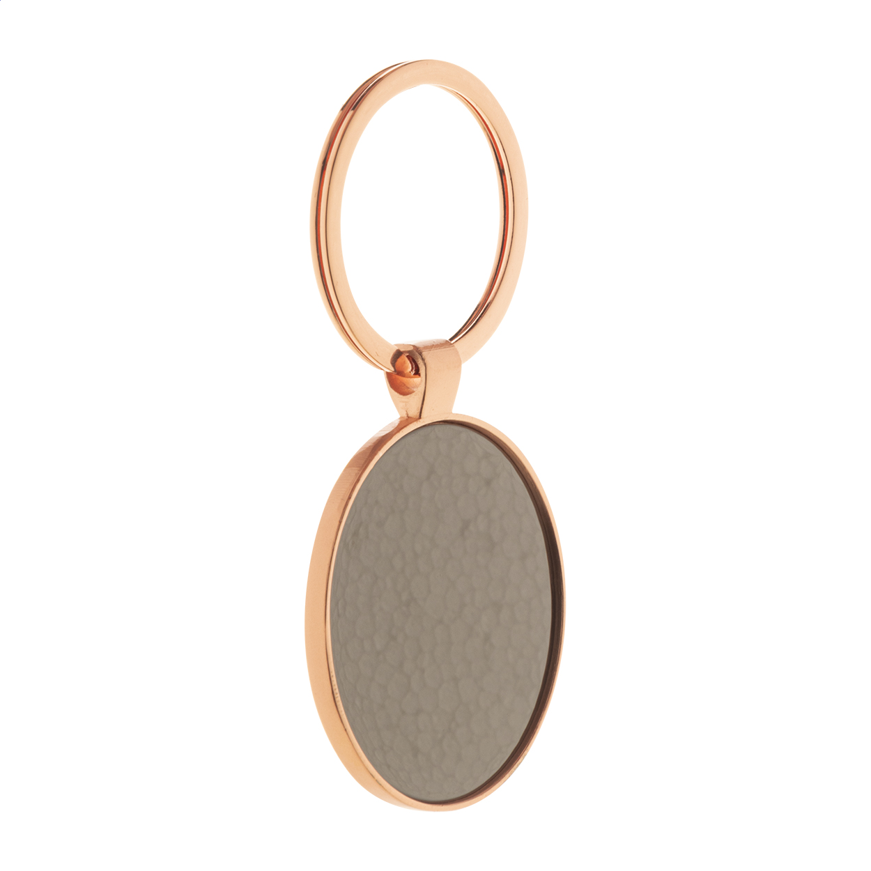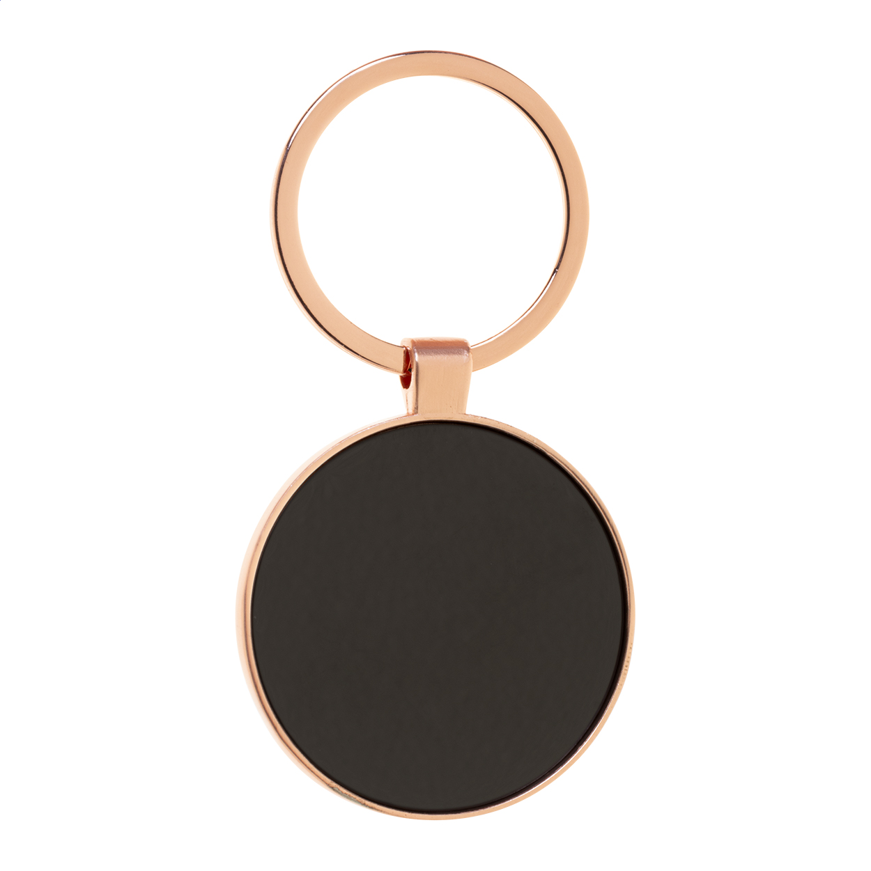 Kulatý kovový přívěsek na klíče ve zlatém provedení s bronzovým plátem. V kraftové papírové krabici.
