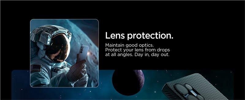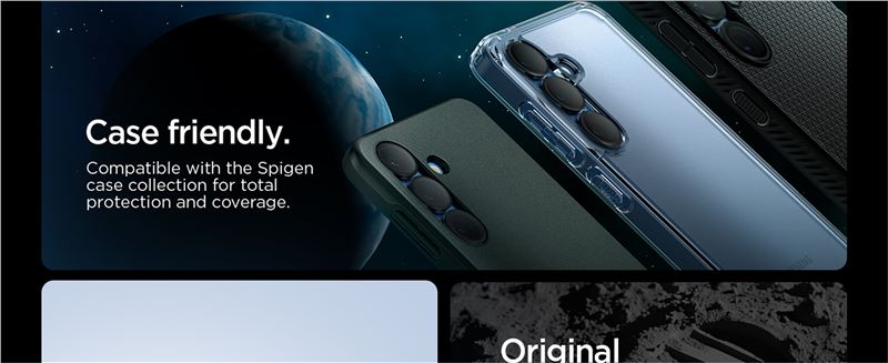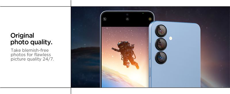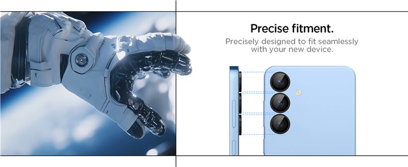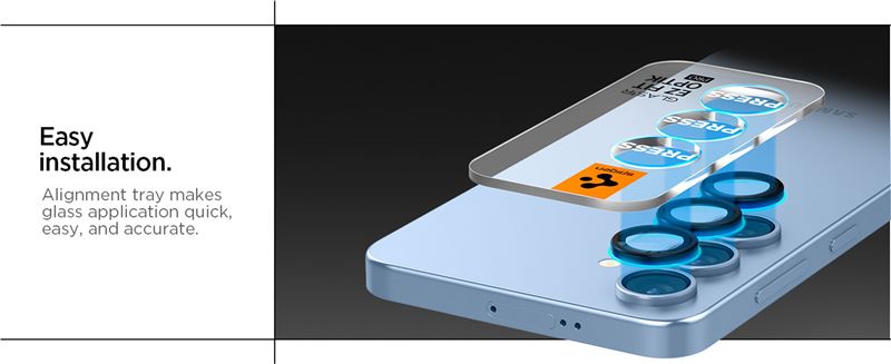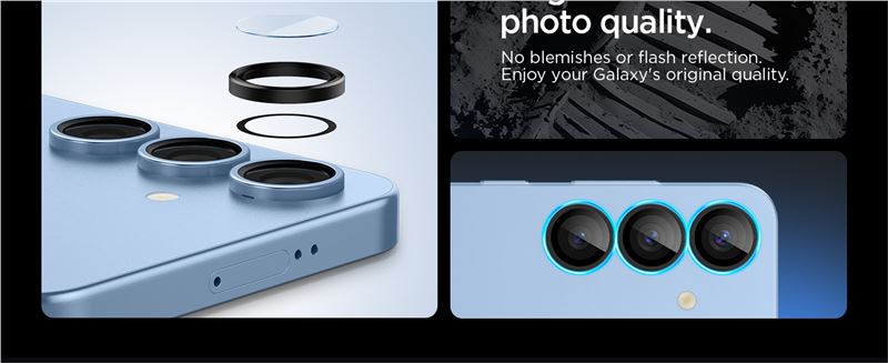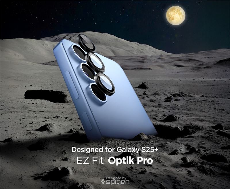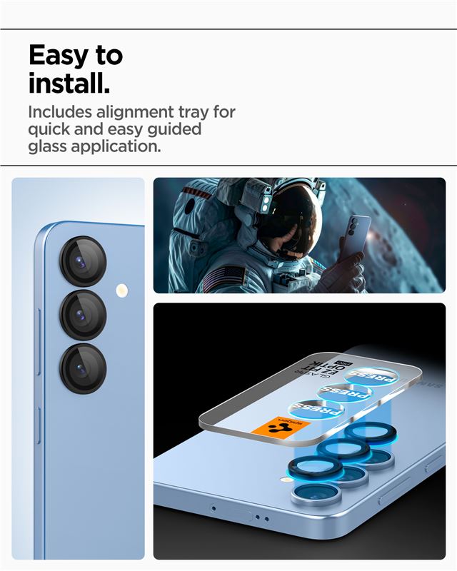 Ochranná sada dvou kusů tvrzeného skla Spigen Glass tR EZ Fit Optik Pro HD v černé barvě precizně kopíruje tvar objektivů telefonu Samsung Galaxy S25+. Povrch dosahující tvrdosti 9H zaručuje dlouhou životnost a stálou ochranu proti poškození při pádu.